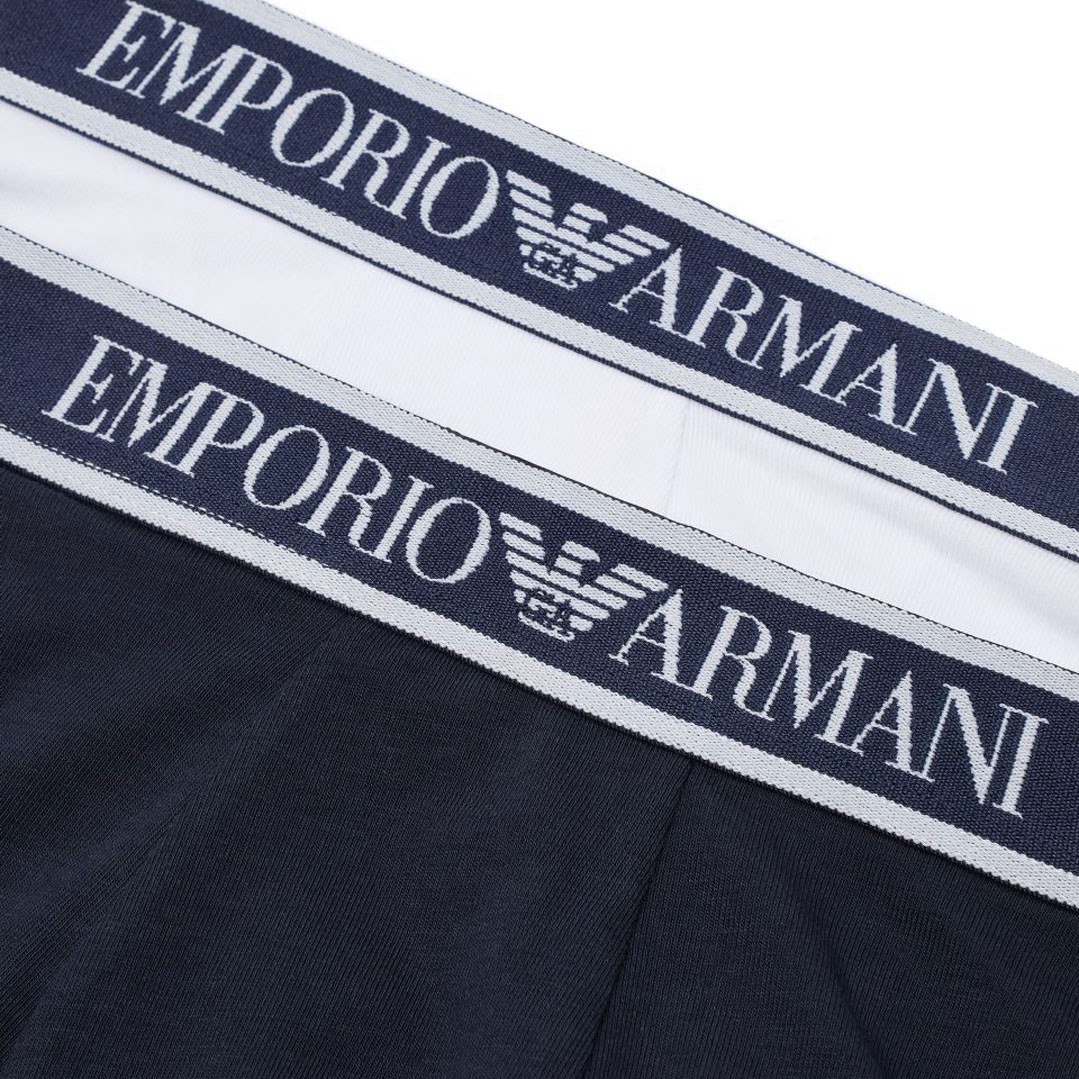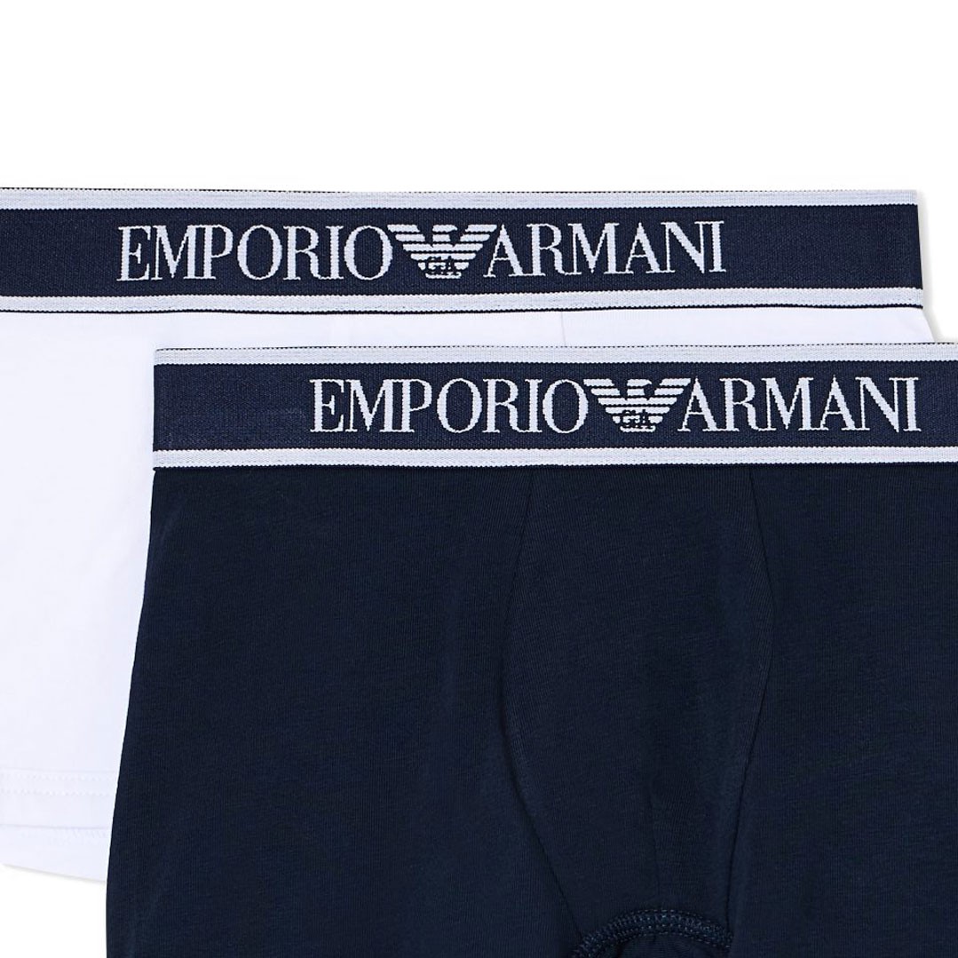 Komplet bielizny składający się z 2 par bokserek chłopięcych Emporio Armani EB000488 AF16036 MB088 w białym i granatowym kolorze. Bokserki wykonane z bawełnianej dzieniny, wykończone logowaną szeroką gumą.