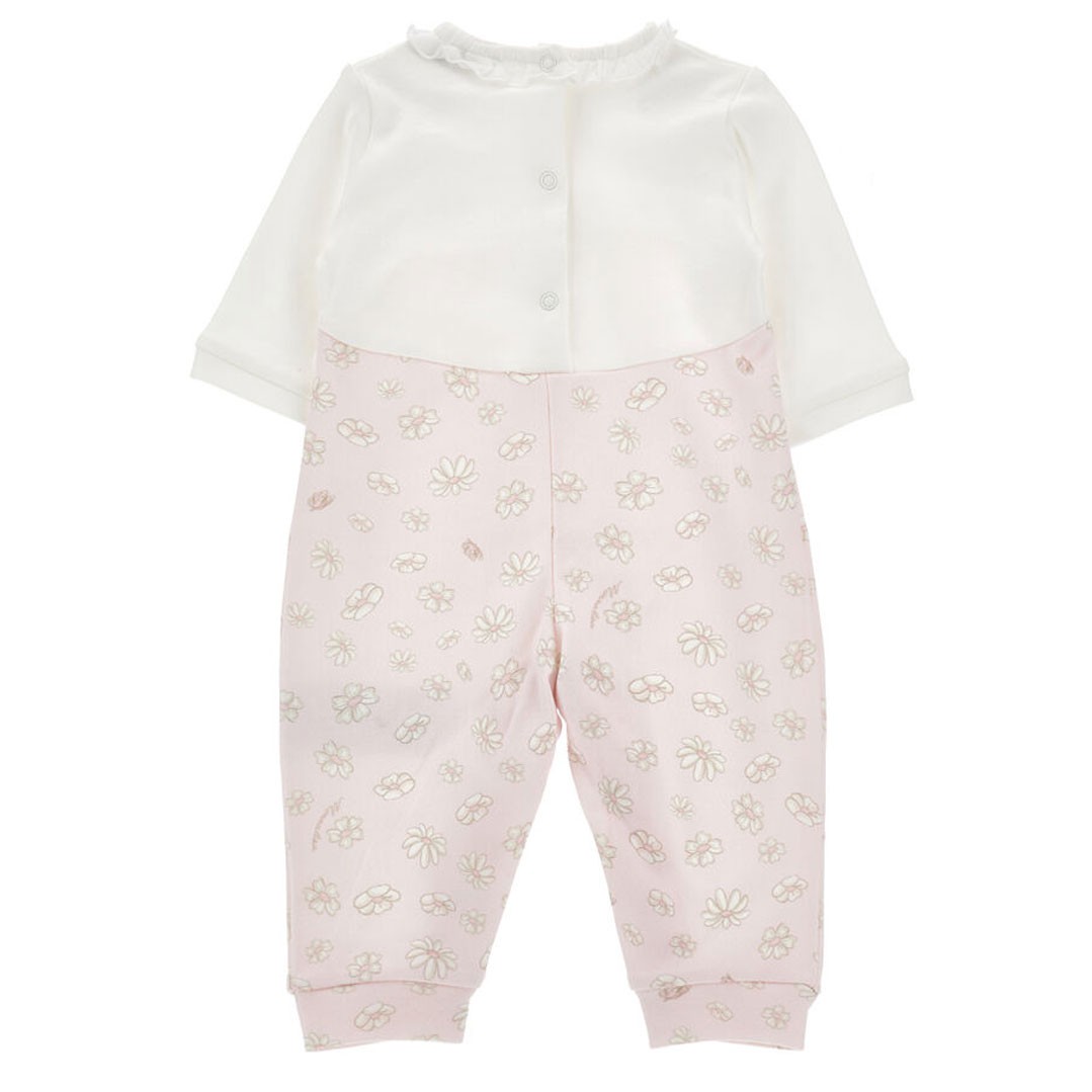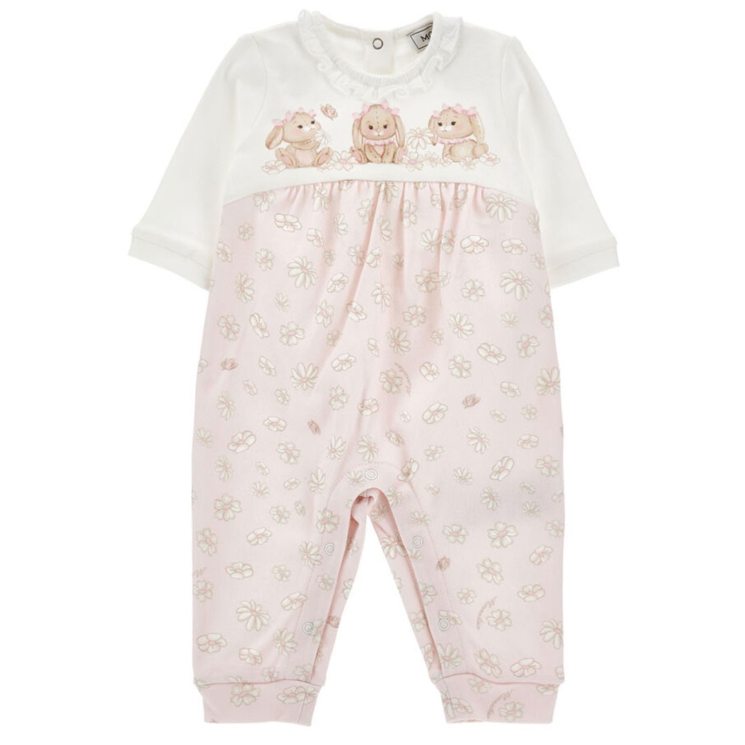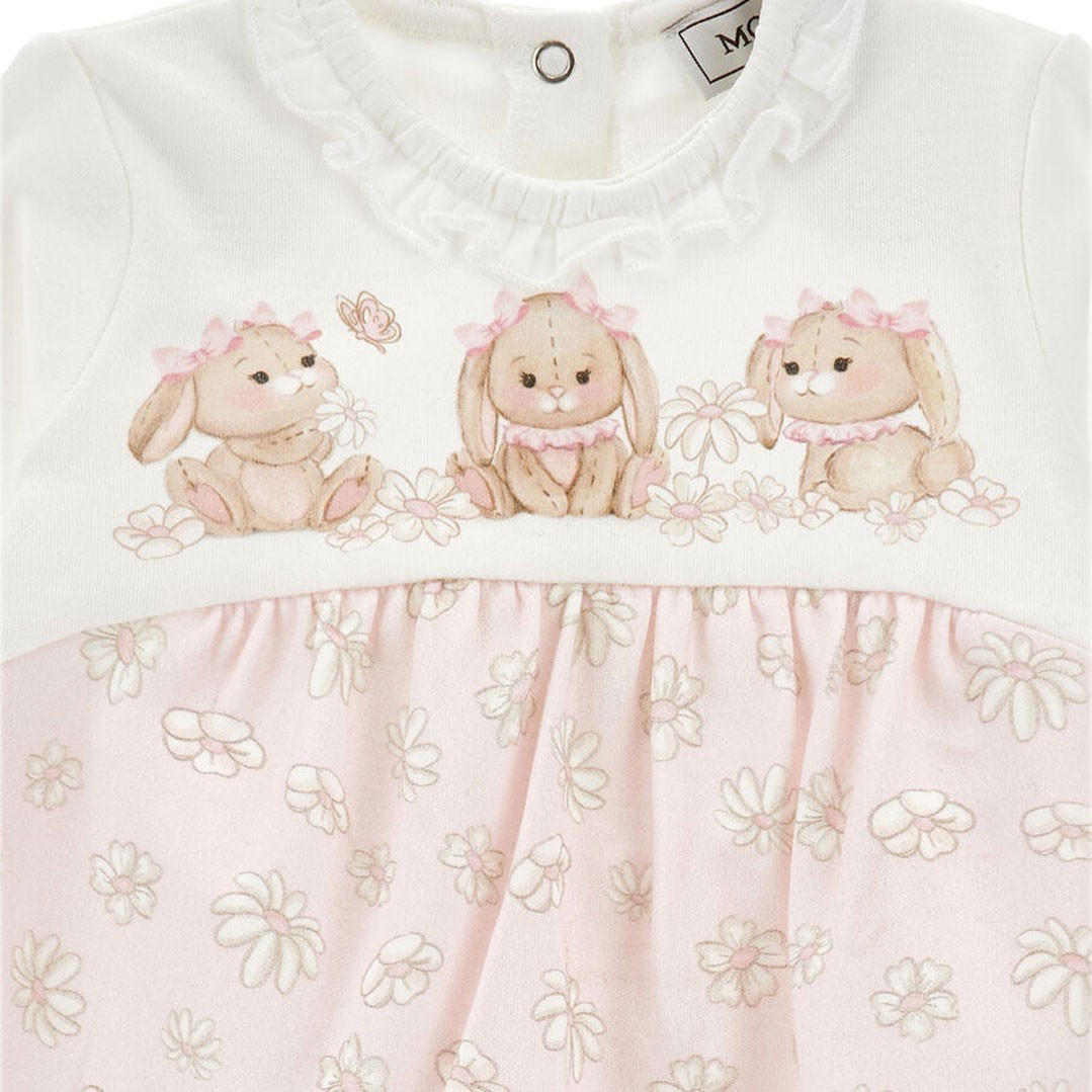 Pajacyk niemowlęcy dla dziewczynki Monnalisa 35G206 7000 0190 LOVE Main Bunnies dostępny w sklepie internetowym euroyoung.pl wykonany jest z miękkiej, przyjaznej dla skóry dziecka dzianiny bawełnianej. Gładka, biała górna część pajacyka ozdobiona jest nadrukiem postaci 3 króliczków i falbanką wokół wycięcia szyi. Dolna część uszyta jest z koordynaty w pastelowym różu w kwiatki i motyle.
