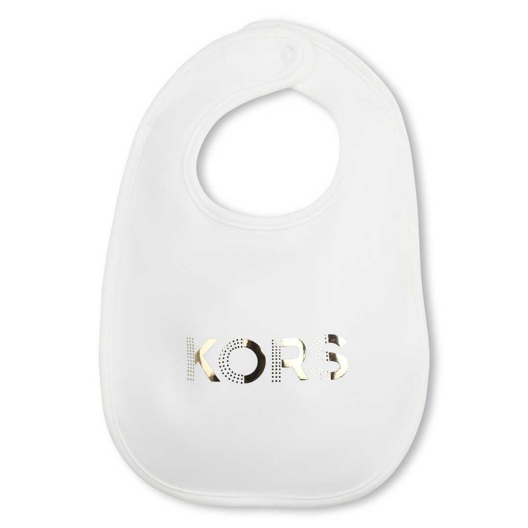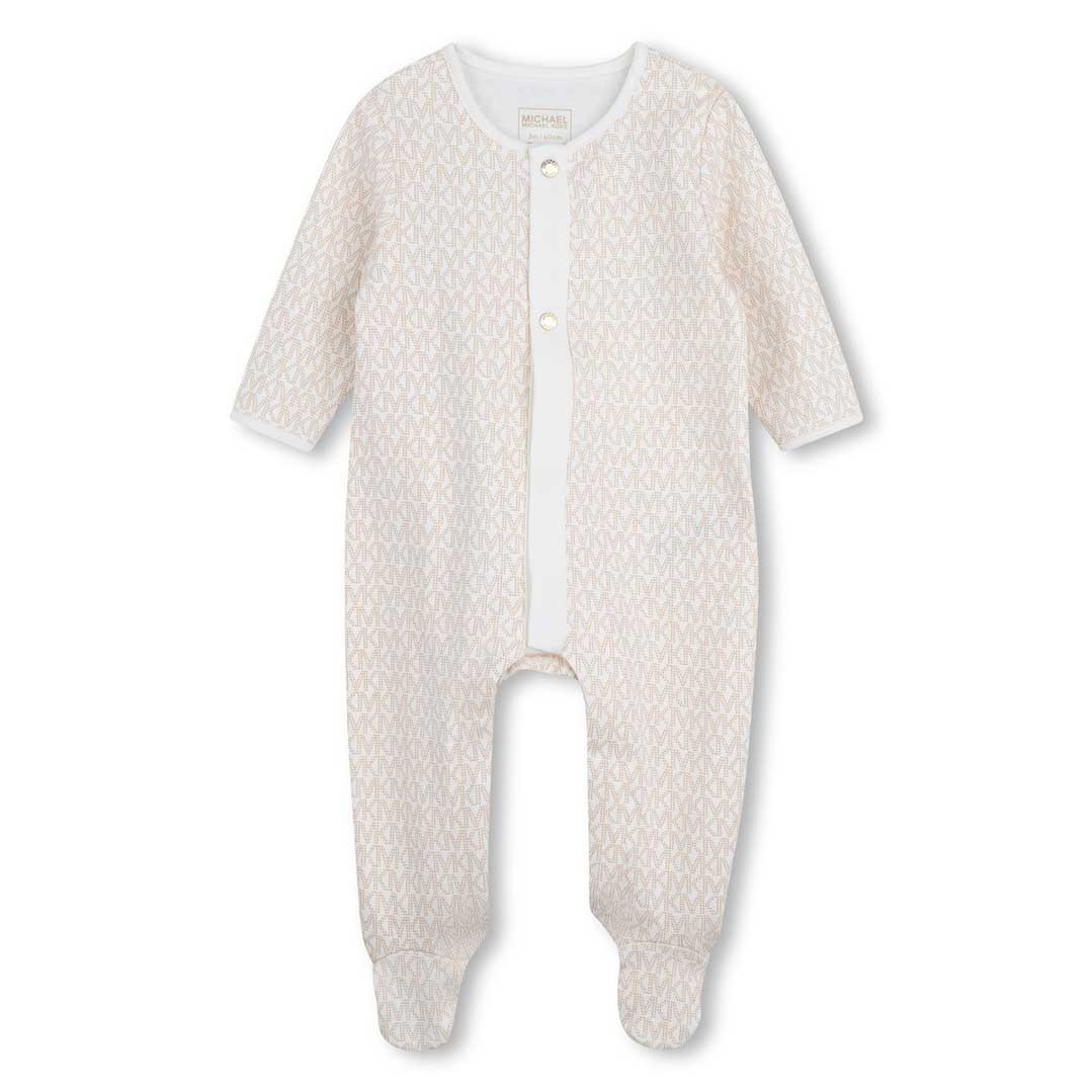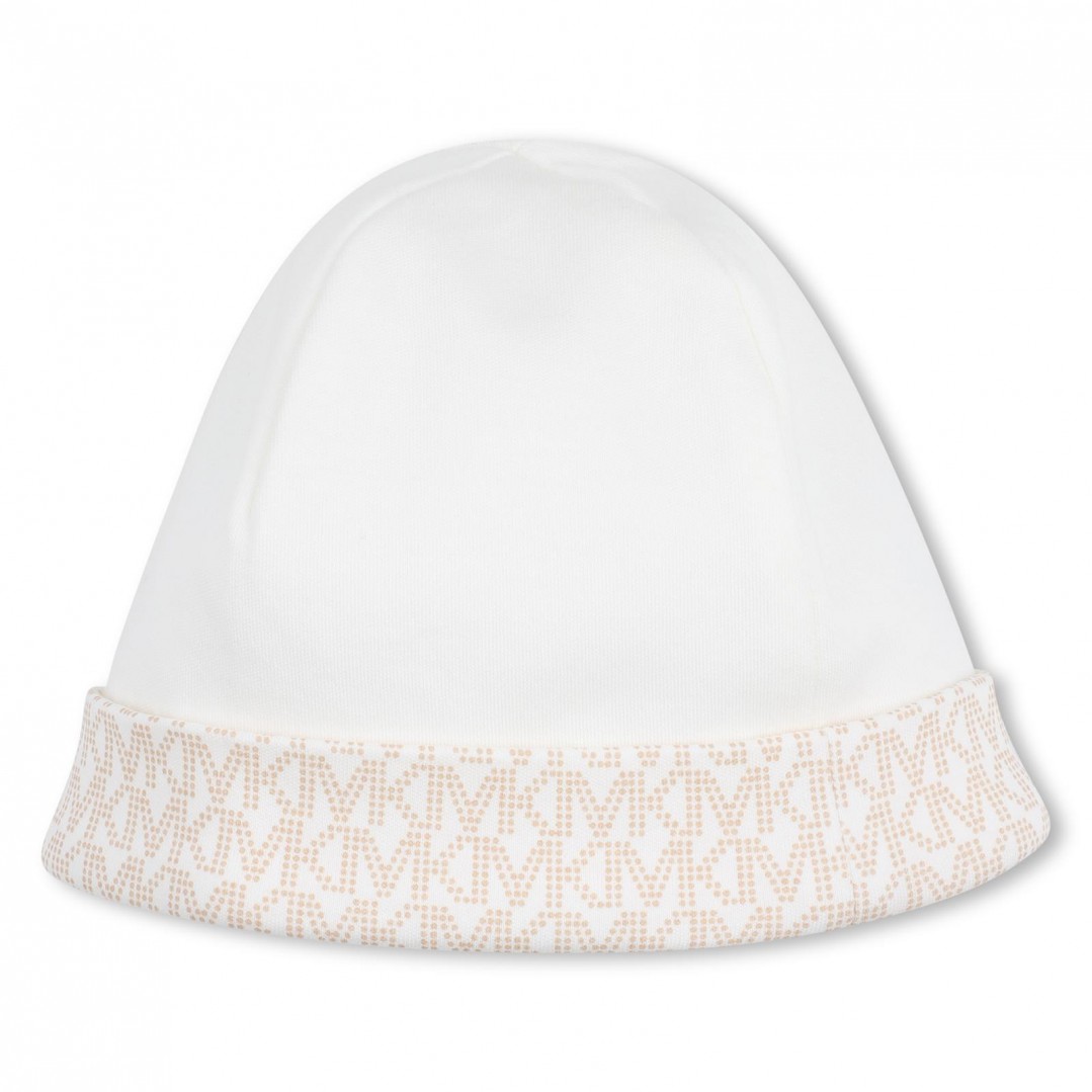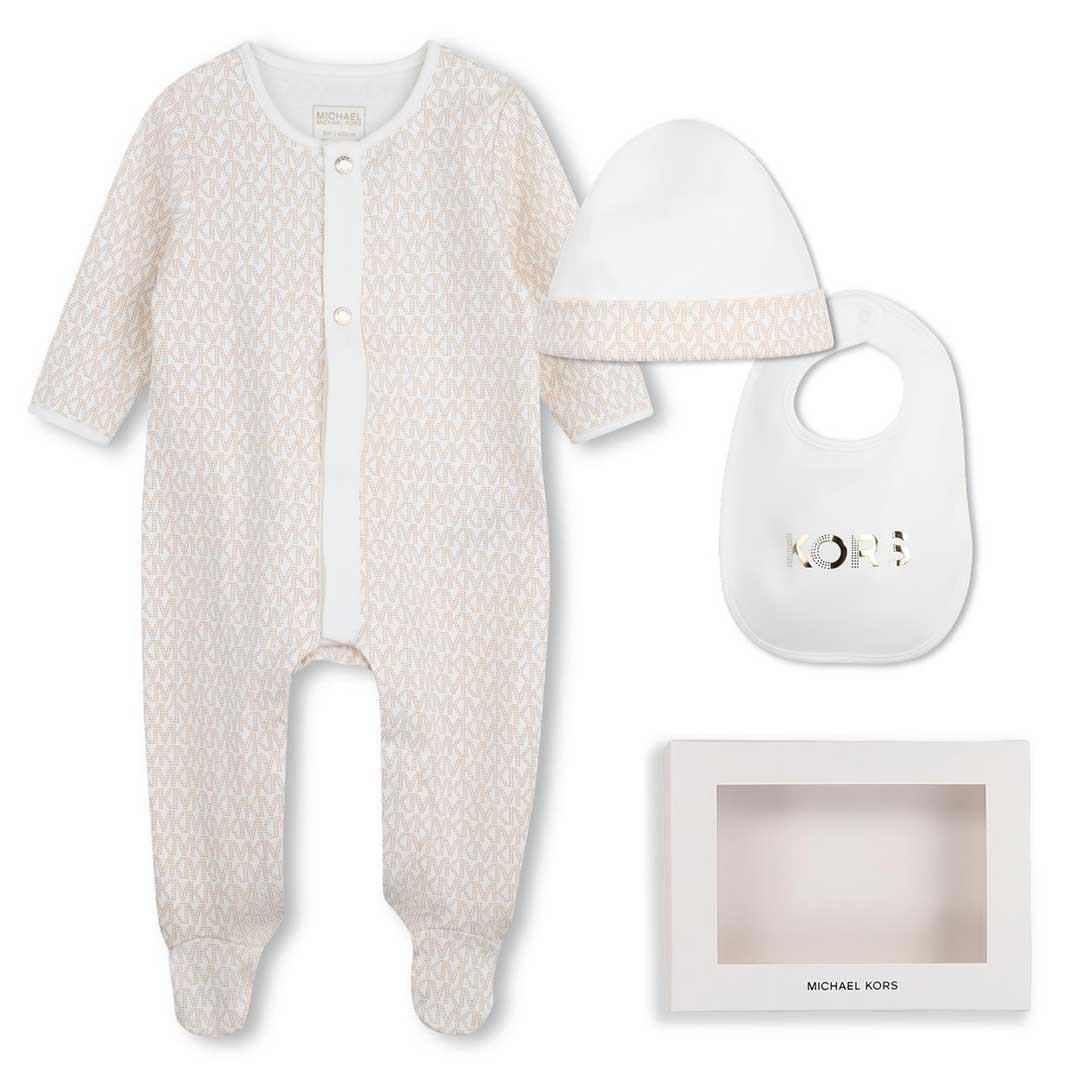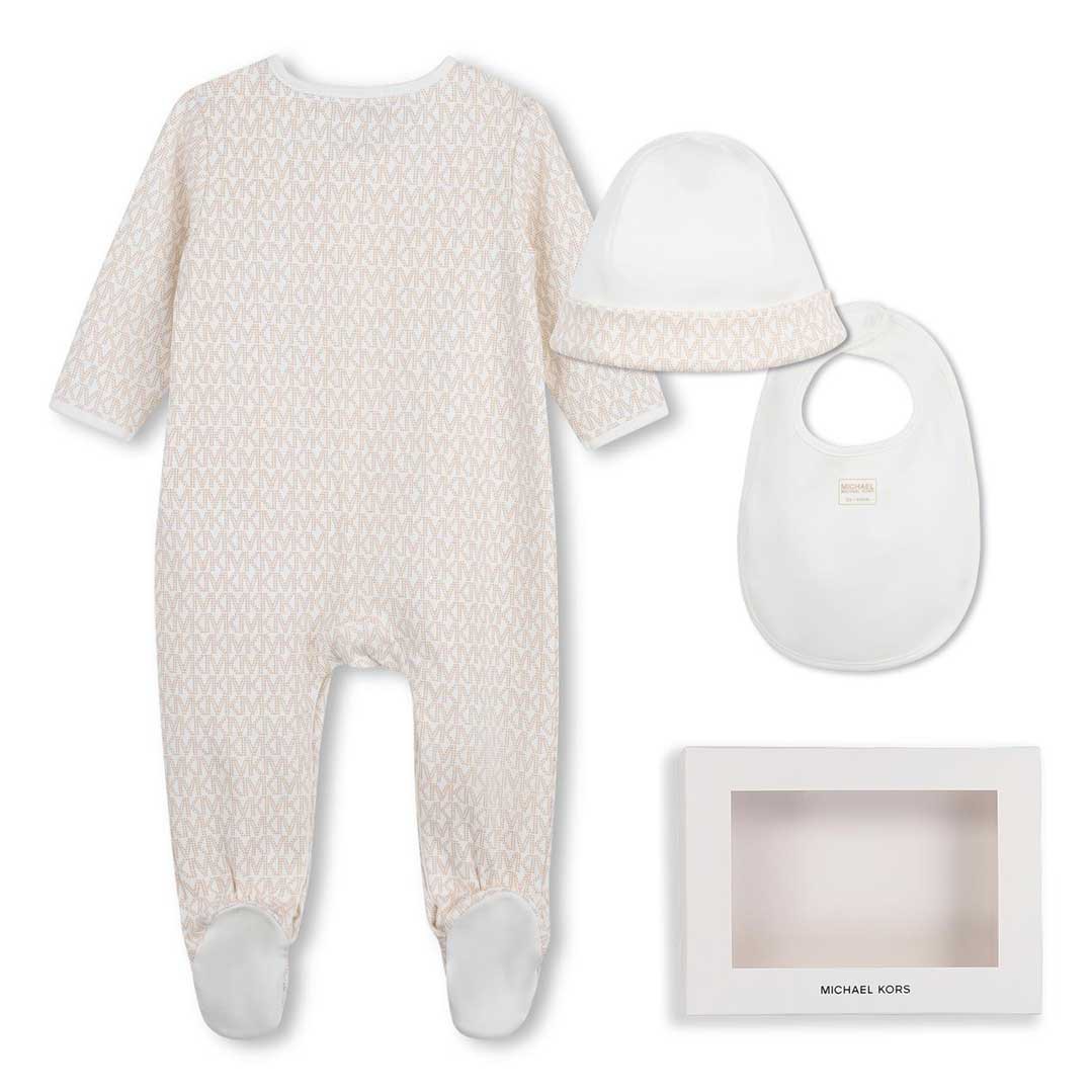 Komplet niemowlęcy Michael Kors R30545 190 uszyty z bawełny organicznej. Komplet składa się z pajacyka, czapeczki iśliniaczka.