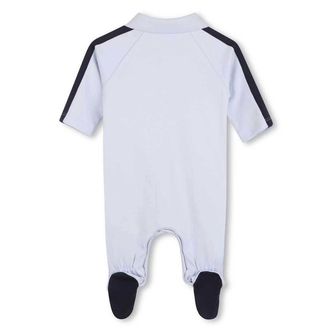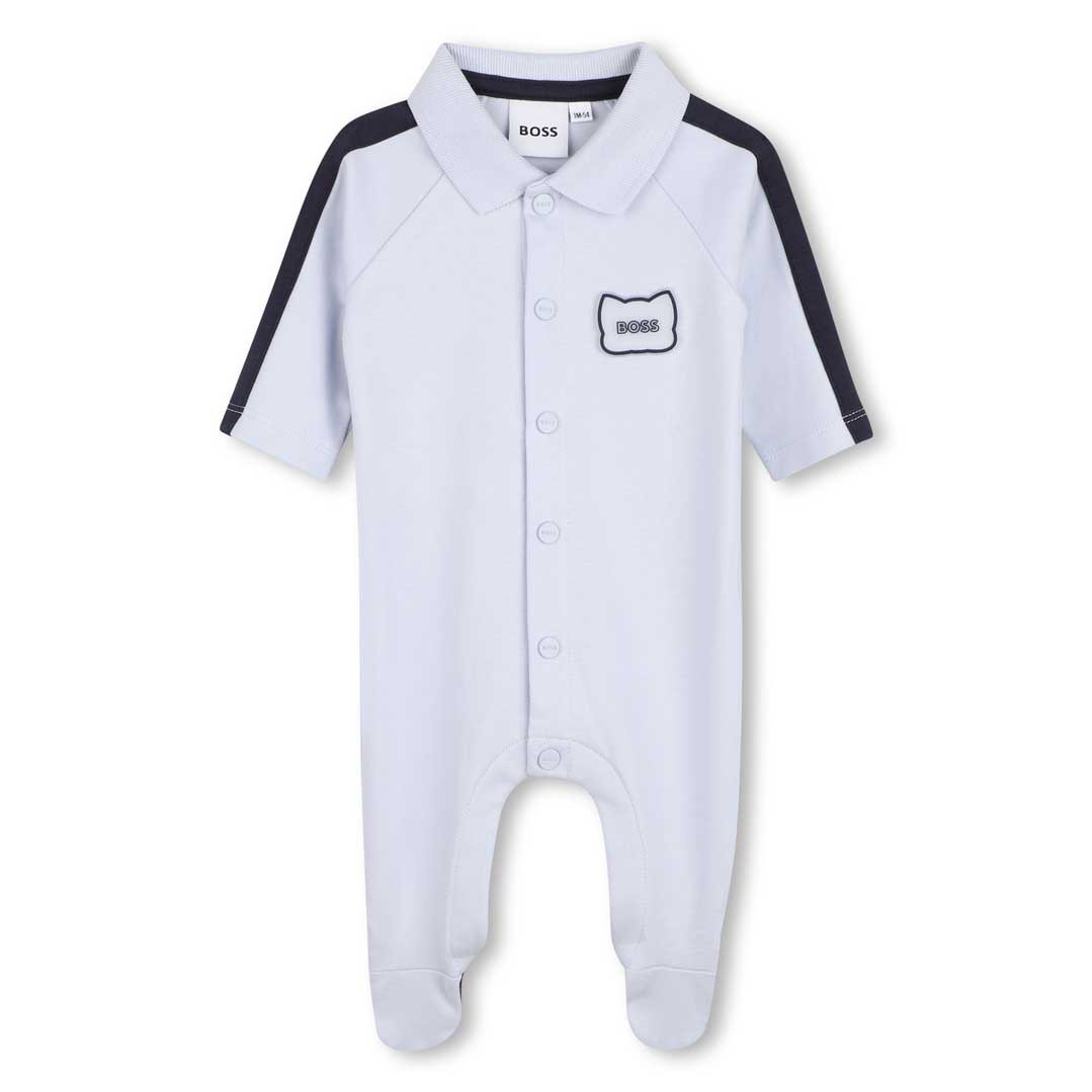 Pajacyk niemowlęcy dla chłopca Hugo Boss J53041 771 uszyty z jasnoniebieskiej dzianiny bawełnianej z upraw ekologicznych.