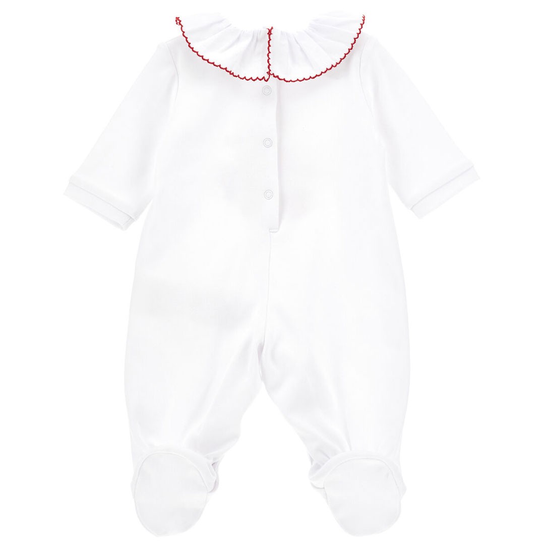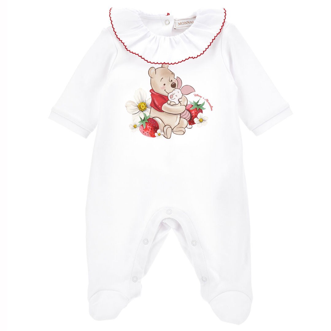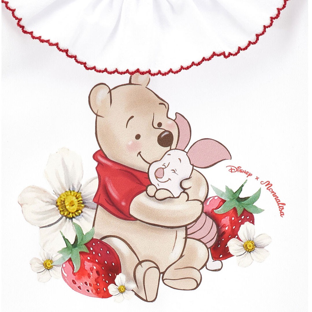Uroczy pajacyk niemowlęcy dla dziewczynki Monnalisa Layette 35G207 7084 0099, ozdobiony postaciami Kubusia Puchatka i Prosiaczka, doskonale dzieciom znanymi bohaterami bajek. Wycięcie pod szyją wykończone jest białą falbanką z czerwoną lamówką.