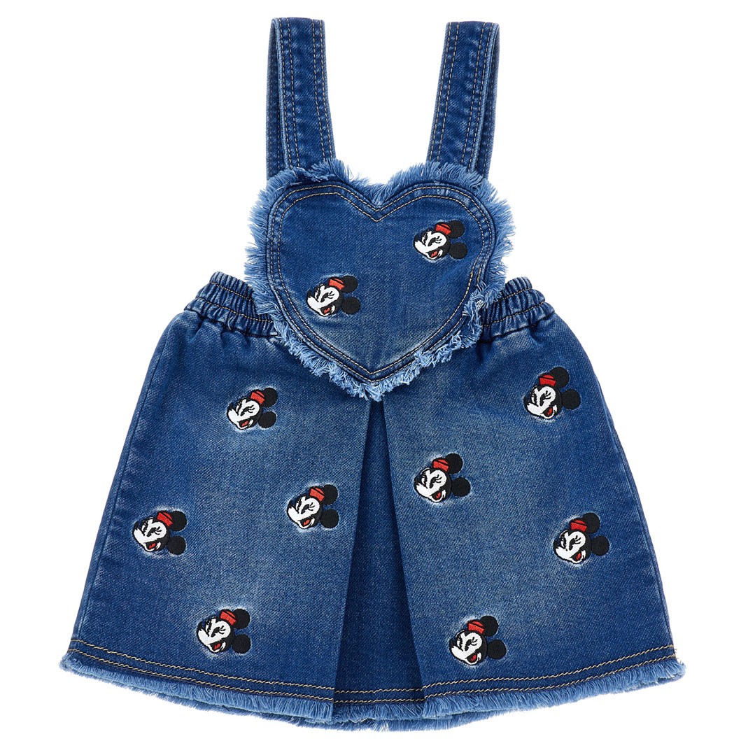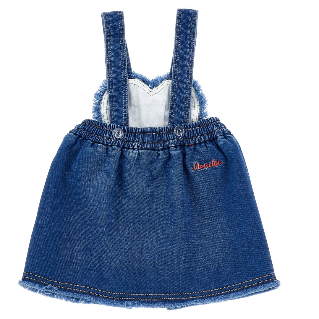 Jeansowa spódniczka Monnalisa 39F703 6043 0055. Model na szelki z karczkiem, przeznaczona dla małej dziewczynki w wieku od 6 do 36 miesiecy. Model z kolekcji Monnalisa Bebe z linii odzieżowej inspirowanej Myszką Minnie. Ciemnoniebieski materiał przypomina klasyczny jeans, ale jest bardzo miękki i przyjemny w dotyku, ozdobiony haftem w Myszki Minnie. Fason gwarantuje wygodę, spódnica jest obszerna, ale dzięki szelkom, nie zsuwa się z malucha. Karczek spódniczki przypomina serduszko. Jego brzeg i dół spódnicy jest postrzępiony.