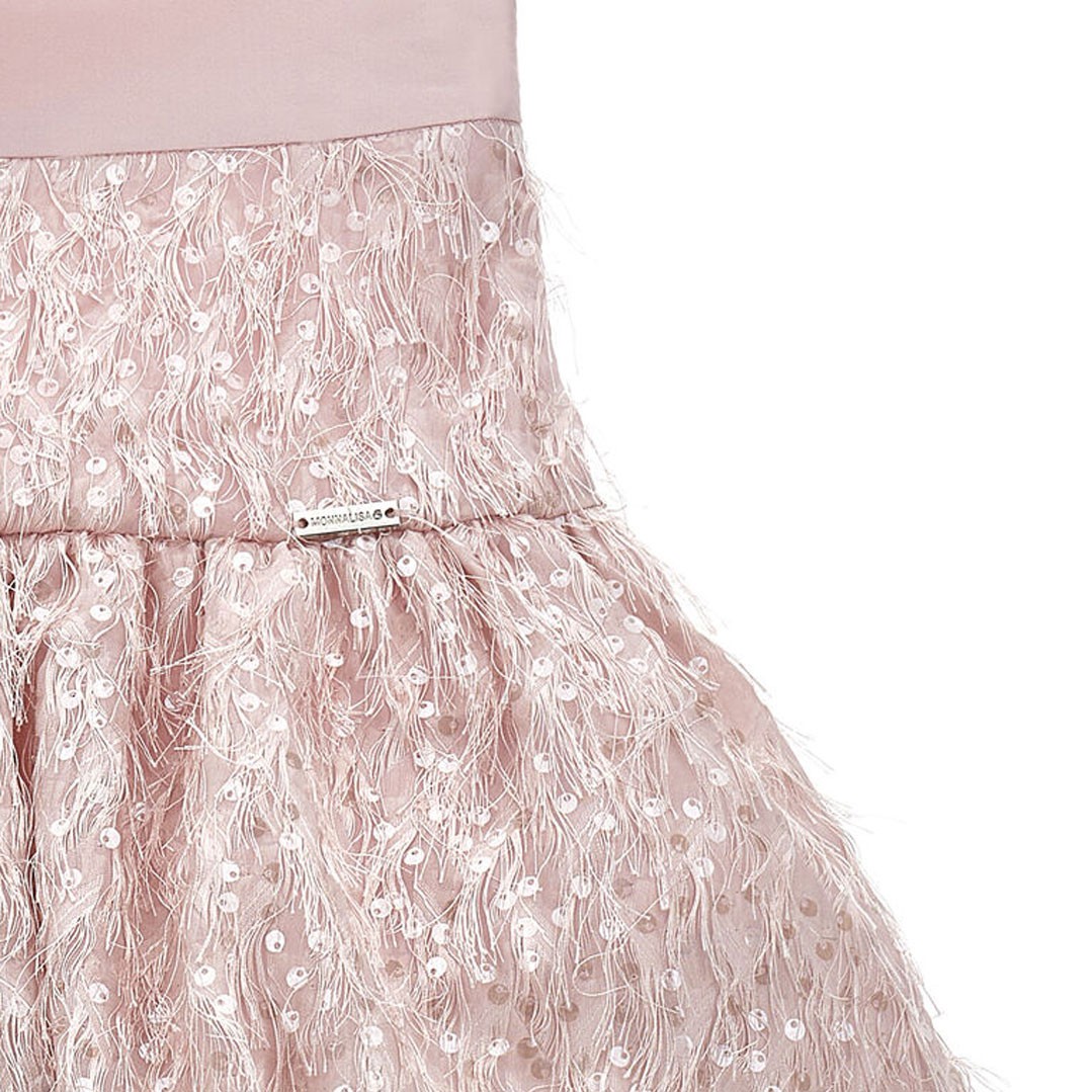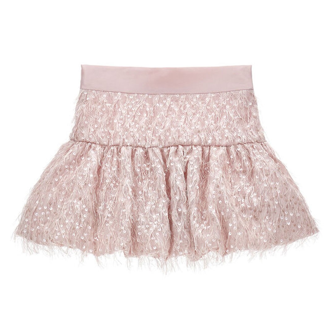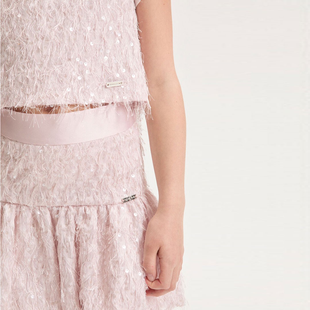 Spódnica dla dziewczynki Monnalisa 79G700 7024 0091 uszyta z oryginalnego materiału o fakturze 3D. Spódniczka z karczkiem jest lekko przymarszczona i odszyta w talii ozdobną taśmą. Podszewka spódnicy wykonana jest z przyjaznej dla skóry dziecka bawełny.