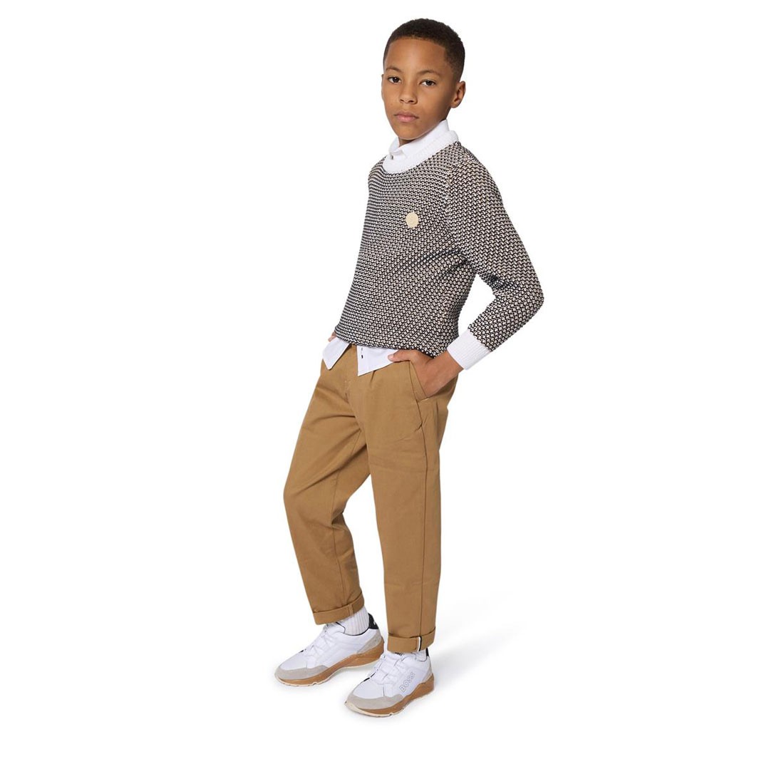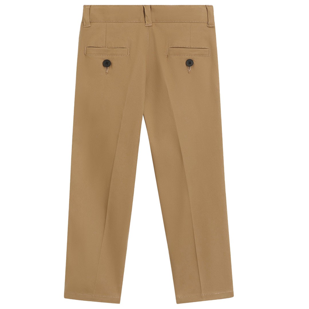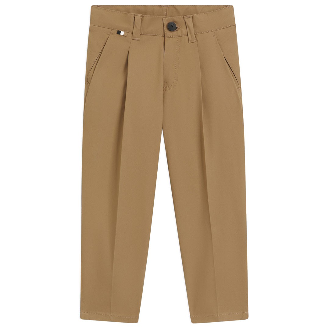 Eleganckie, chłopięce spodnie z zaszewkami Hugo Boss J52298 269 uszyte z bawełnianego twillu w karmelowym kolorze. Materiał o ukośnym splocie charakteryzuje się dużą trwałością, wytrzymałością i odpornościa na zuzycie.