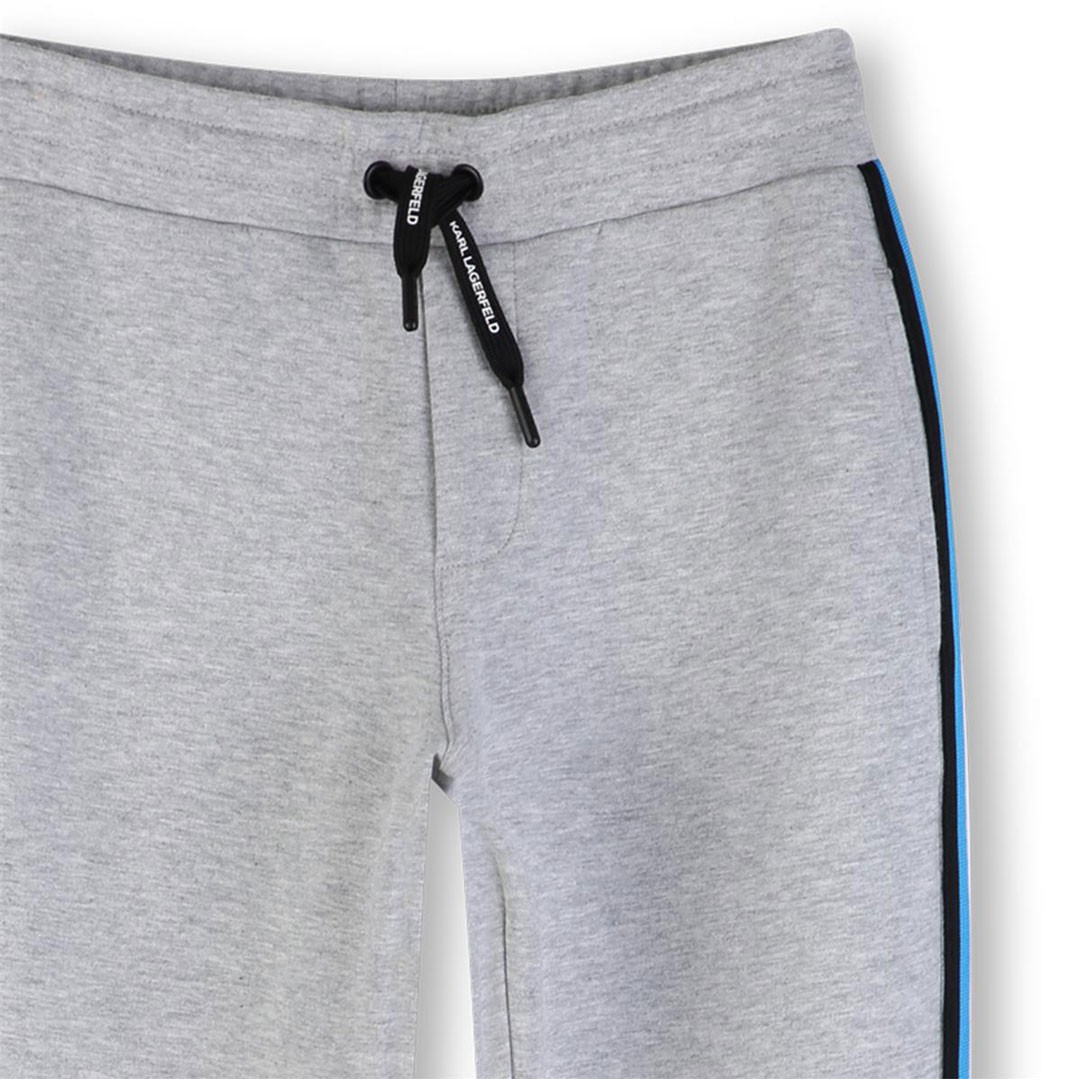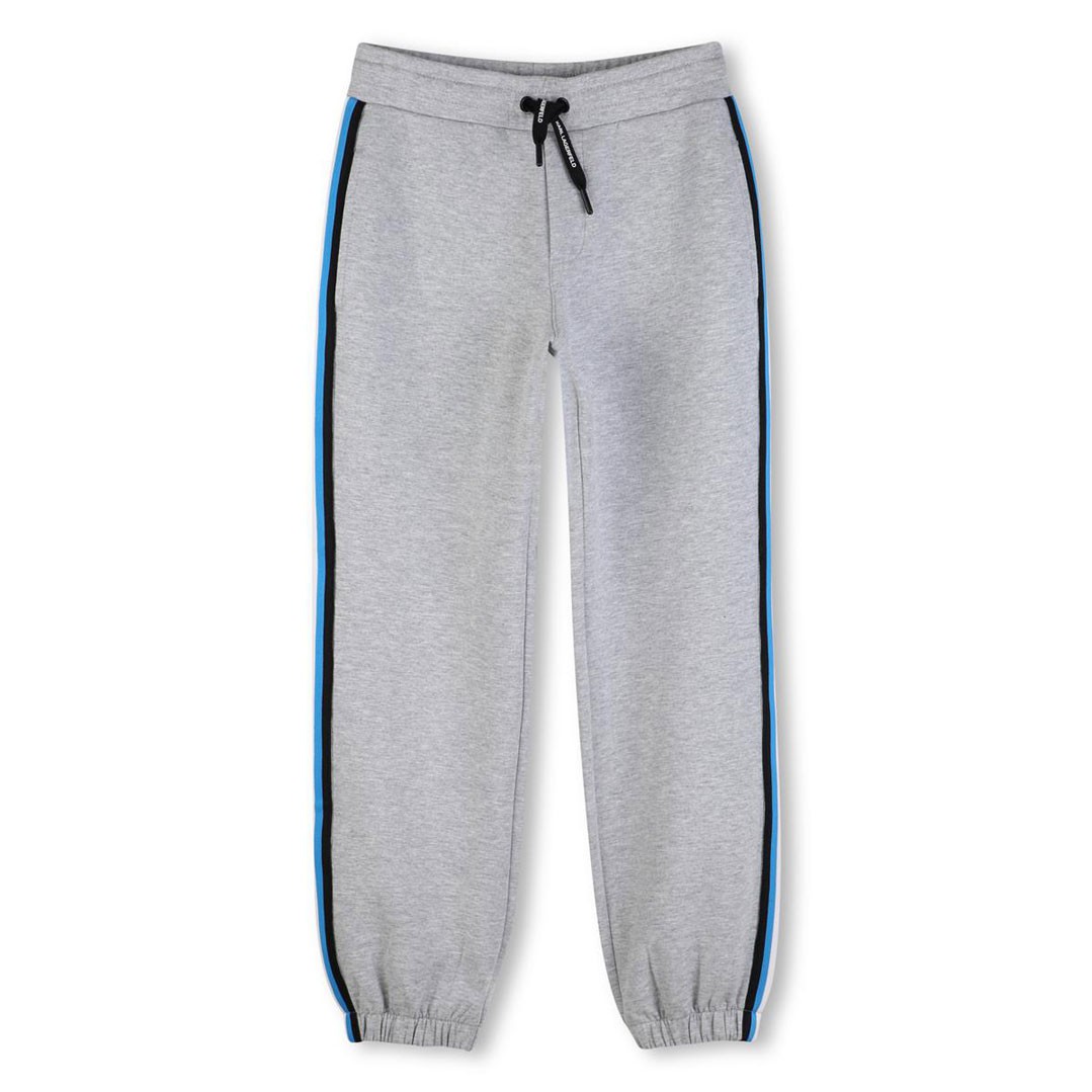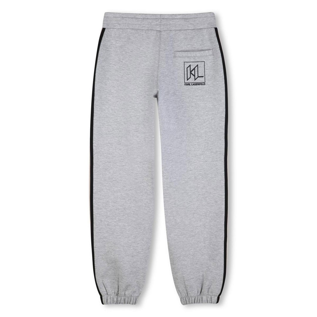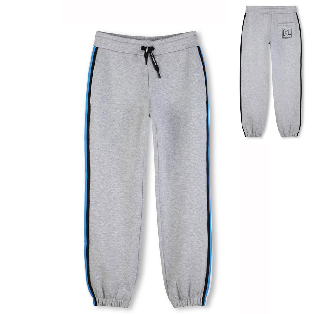 Szare, sportowe spodnie chłopięce Karl Lagerfeld Z31109 A07. Model ze ściągaczami na dole nogawek i w pasie. W talii dodatkowo czarny troczek. Wzdłuż nogawek naszyte kolorowe kontrastujące lampasy. Z tyłu 1 kieszeń ozdobiona monogramem.