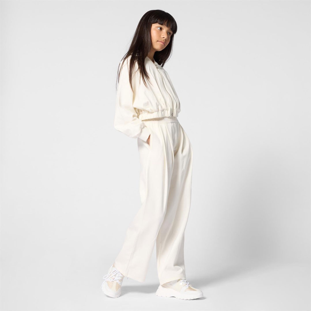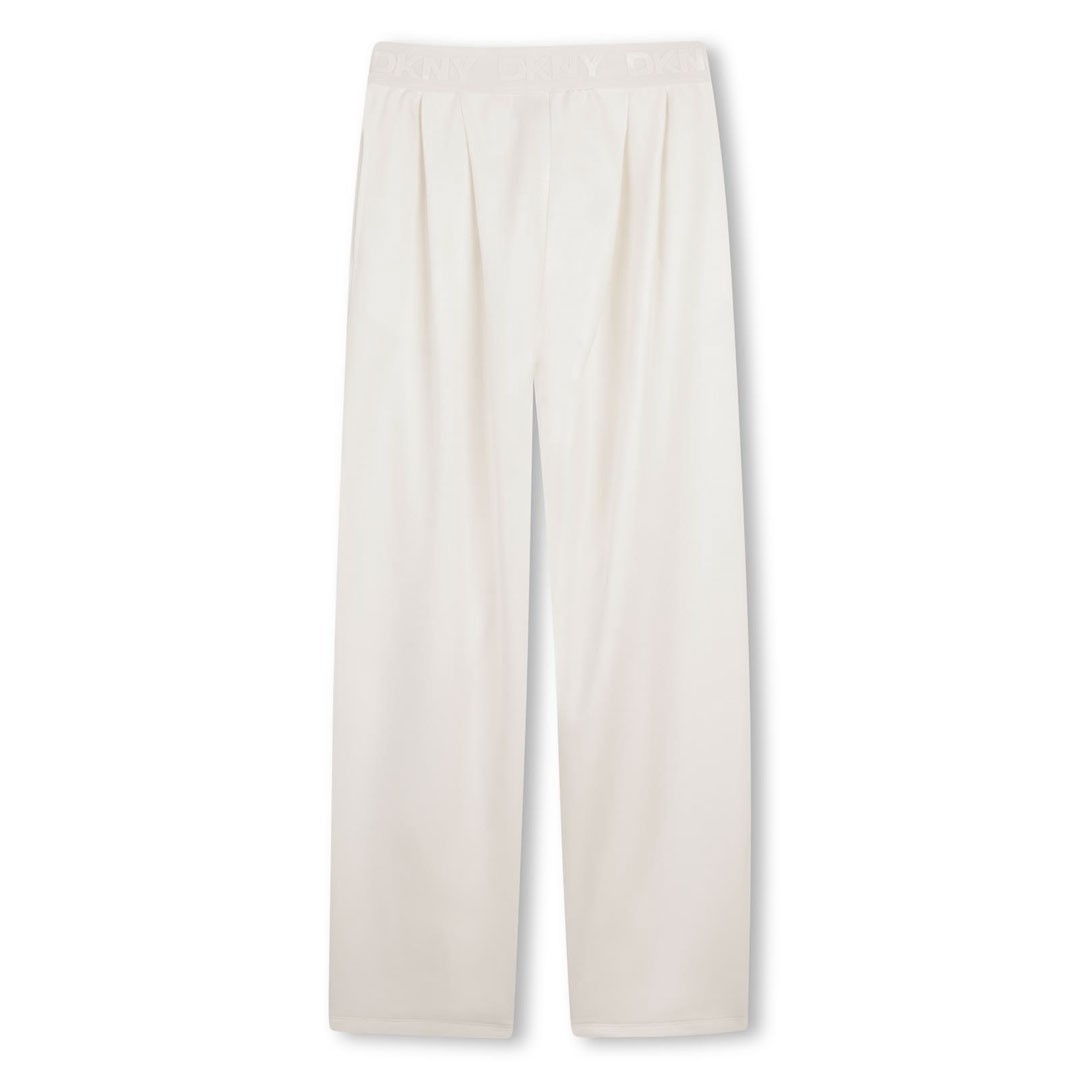 Jasne, wygodne spodnie dla dziewczynki DKNY D62583 519. Obszerny fason z zaszewkami i logowaną gumą w pasie. Po bokach wpuszczane kieszenie.