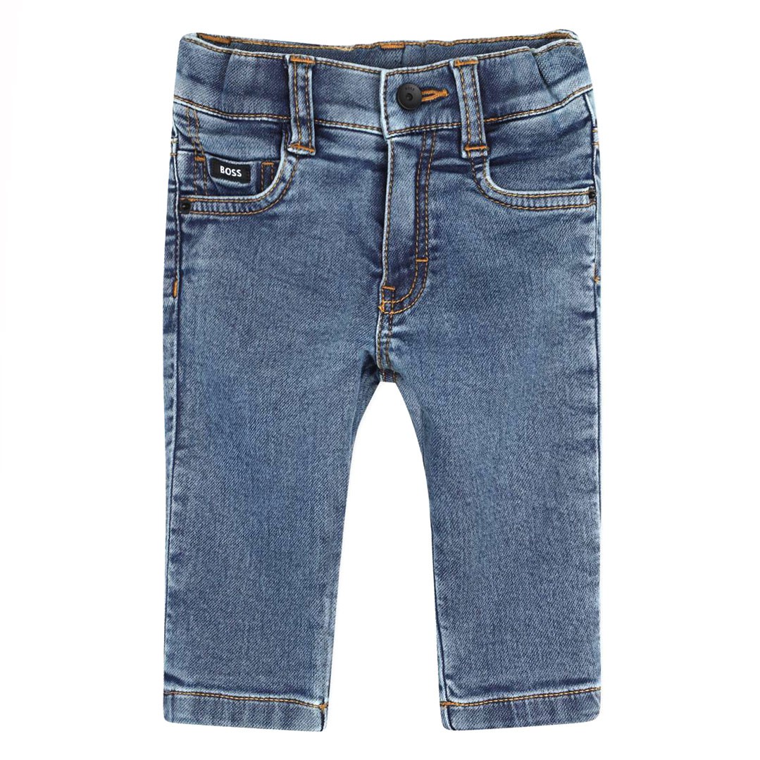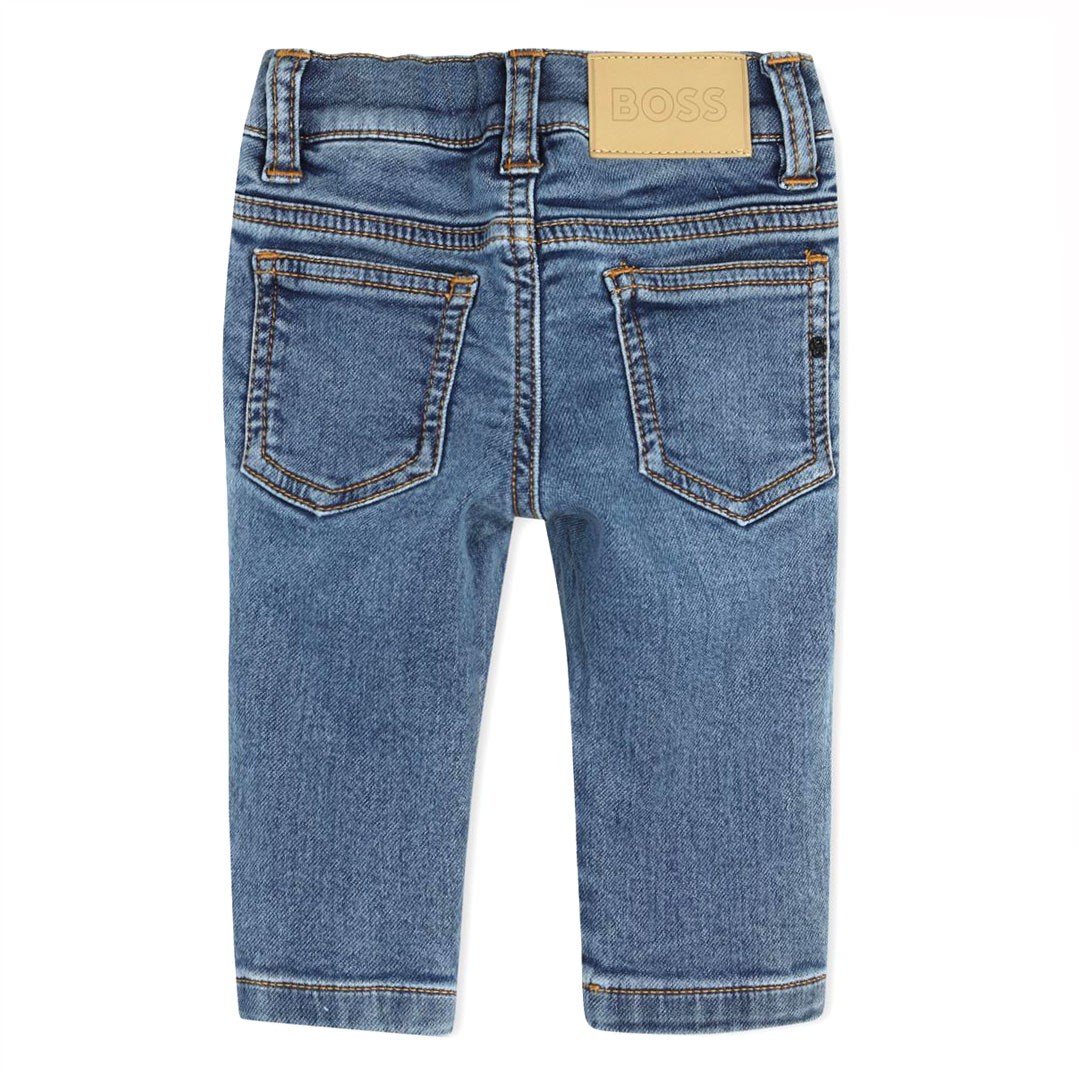 Miękkie jeansy niemowlęce dla chłopczyka Hugo Boss J52857 Z18. Klasyczny model w niebieskim kolorze z eastycznego, przyjemnego w dotyku materiału.