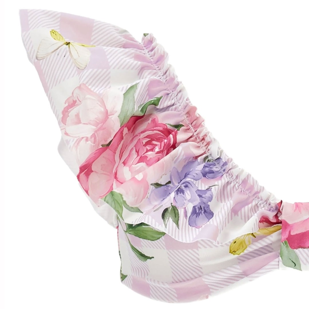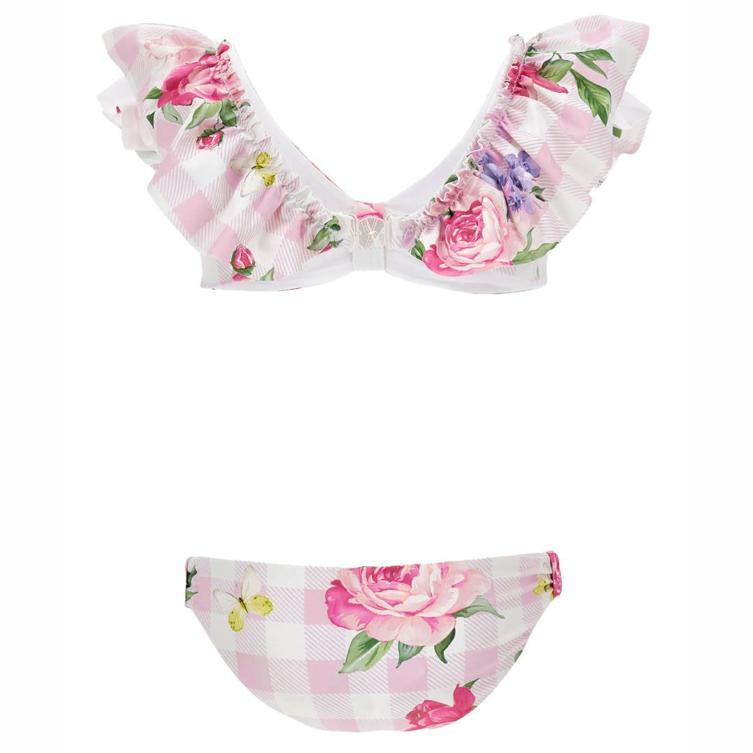 Kostium kąpielowy dla dziewczynki Monnalisa 19G002 7052 0090, model dwuczęściowy, uszyty z elastycznego materiału drukowanego we wzór florystyczny na tle pastelowej różowej kratki. Dziewczęcy charakter kostiumu podkreślają urocze falbanki zdobiące górną część bikini.