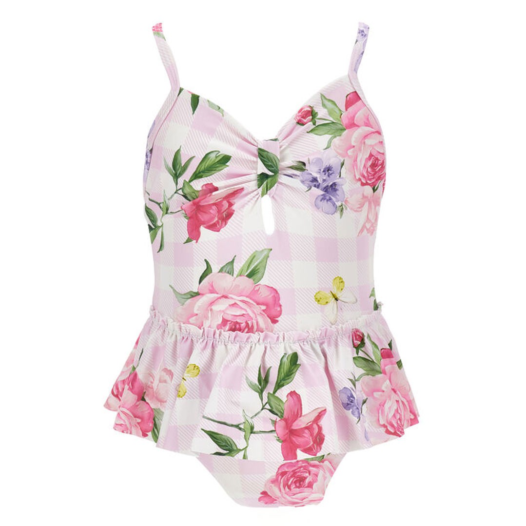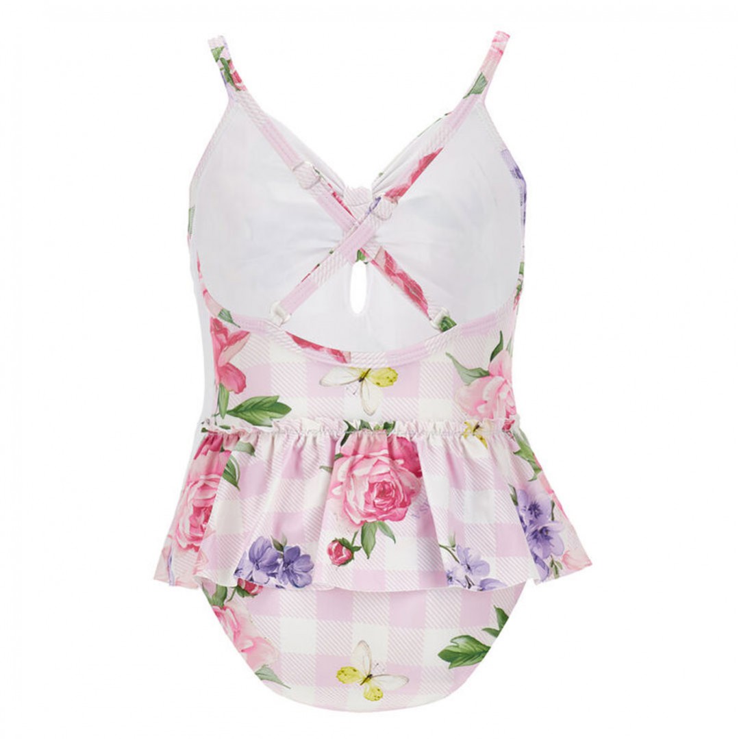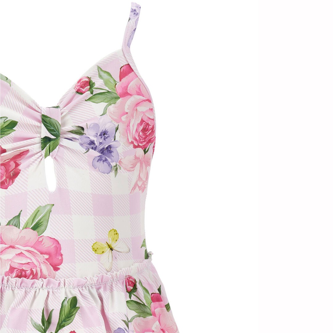 Jednoczęściowy strój kąpielowy dla dziewczynki Monnalisa 19G003 7052 0090, uszyty z elastycznego materiału drukowanego we kolorowy, kwiatowy wzór na tle pastelowej różowej kraty. Uroczego, dziewczęcego charakteru kostiumowi nadaje naszyta w talii baskinka tworząca jakby krótką spódniczkę. Krzyżujące się na plecach ramiączka zapobiegają zsuwaniu się pasków z ramion. Istnieje możliwość regulacji długości ramiączek.