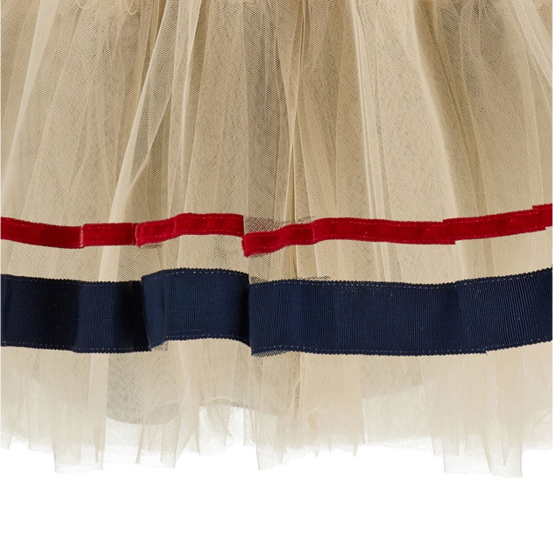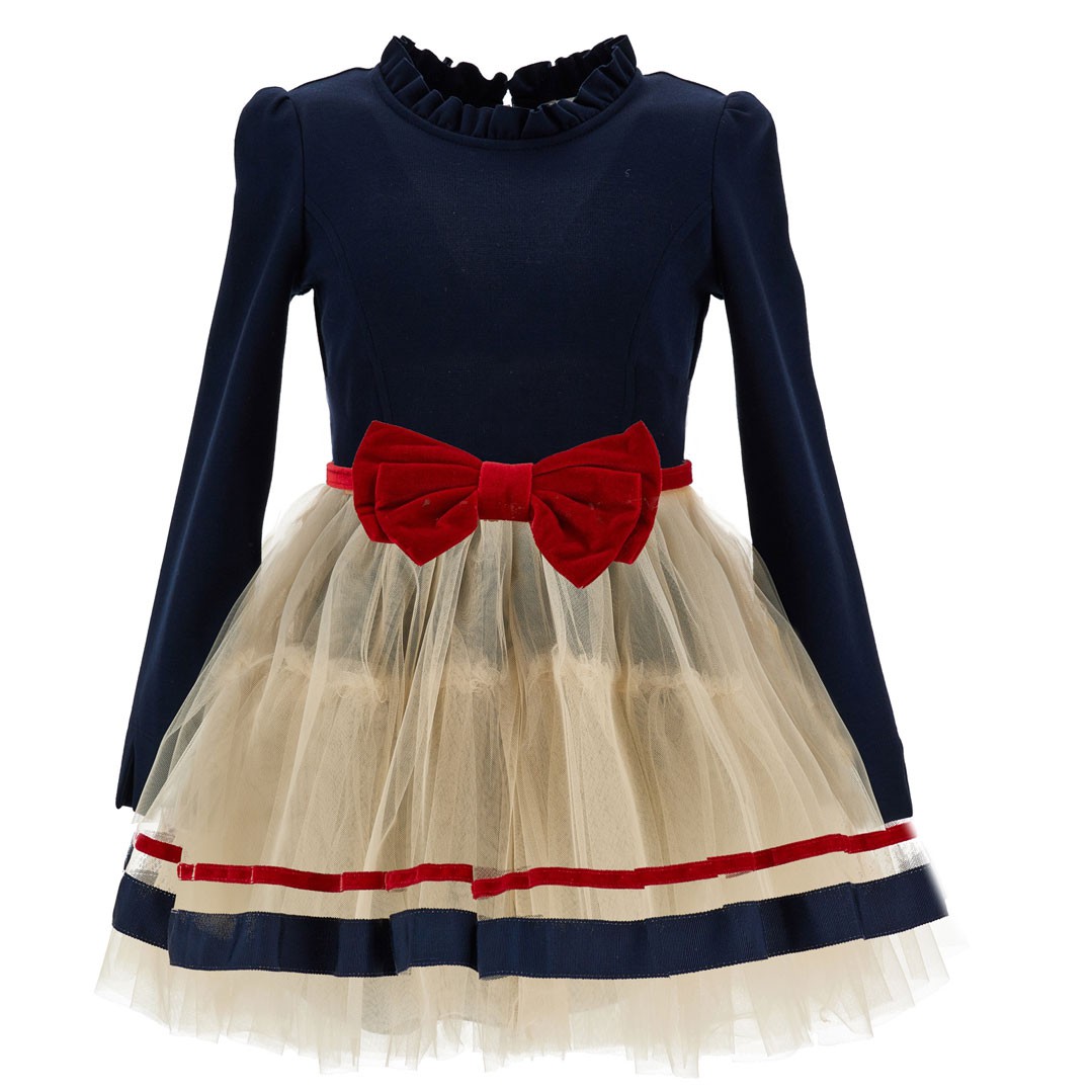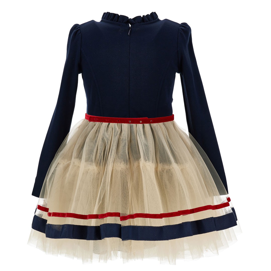 Elegancka, wizytowa sukienka dla dziewczynki Monnalisa 11F908RU 6207 056S. Górna część wykonana z elastycznej, granatowej dzianiny, która nie krępuje ruchów dziecka. Dolna część sukienki uszyta z wielu warstw tiulu w naturalnym, beżowym kolorze, które ozdobione są dwoma, poziomo naszytymi paskami, kontrastującymi z sukienką. Oryginalną ozdobą sukienki jest czerwony, welurowy paseczek z dużą kokardą z przodu, sprzedawany w zestawie z sukienką. Bawełniana podszewka jest przyjazna dla skóry dziecka. Ze względu na kolorystykę model Monnalisa 11F908RU 6207 056S sprawdzi się również jako sukienka świateczna dla dziewczynki.