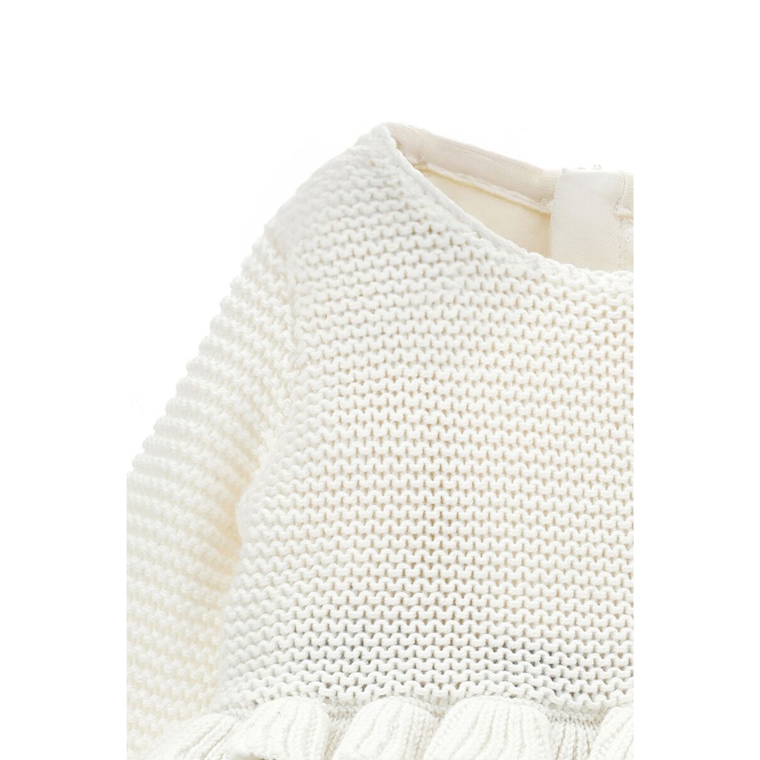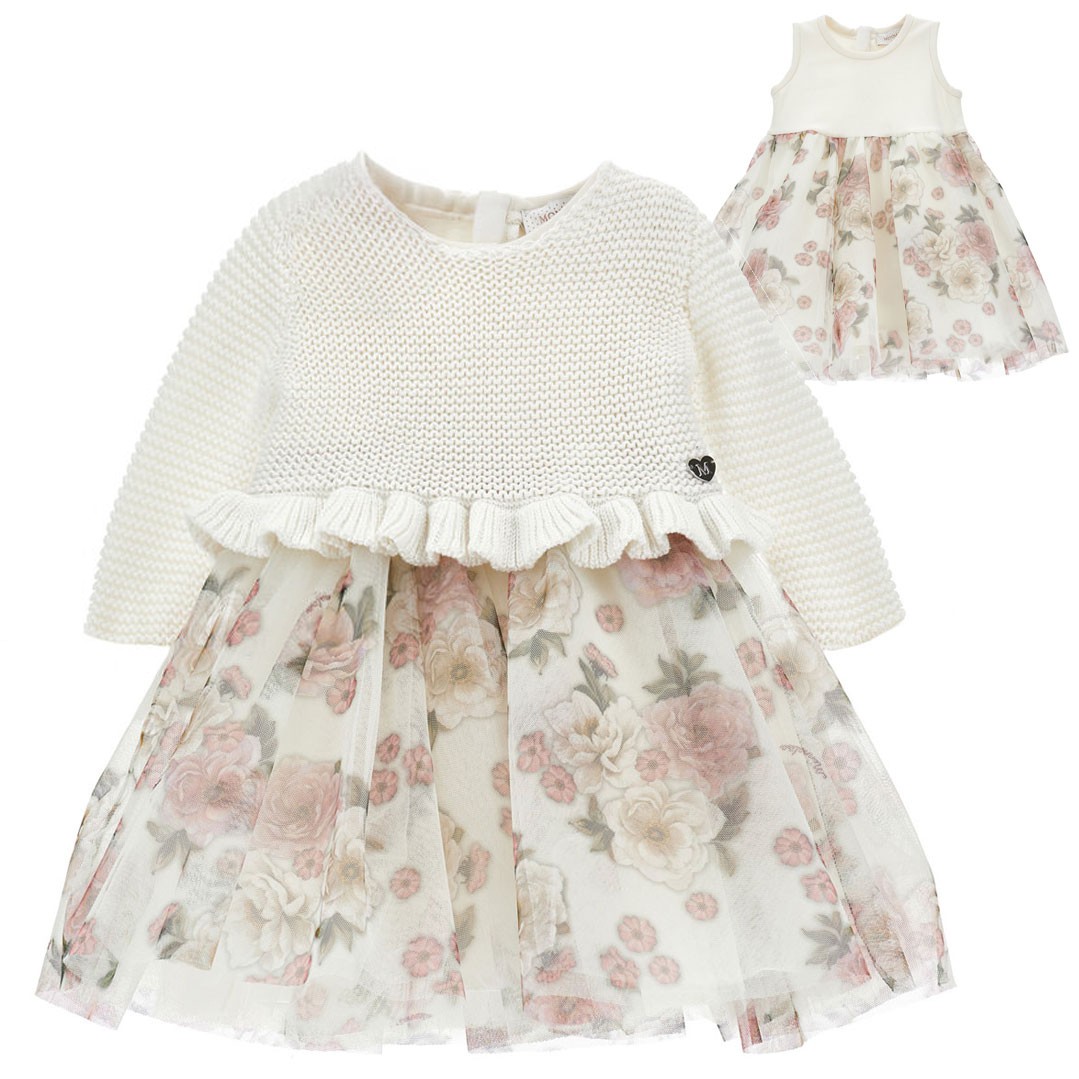 Piękna dwuczęściowa sukienka niemowlęca Monnalisa 31F911 6664 0291, przeznaczona dla dziewczynki w wieku od 6 miesiecy do 3 lat. Sukienka bez rękawów z gładkim karczkiem i piękną dolną częścią z ażurowego materiału drukowanego w kwiaty. Dodatkowym elementem sukienki 31F911 6664 0291 jest kremowy sweterek.