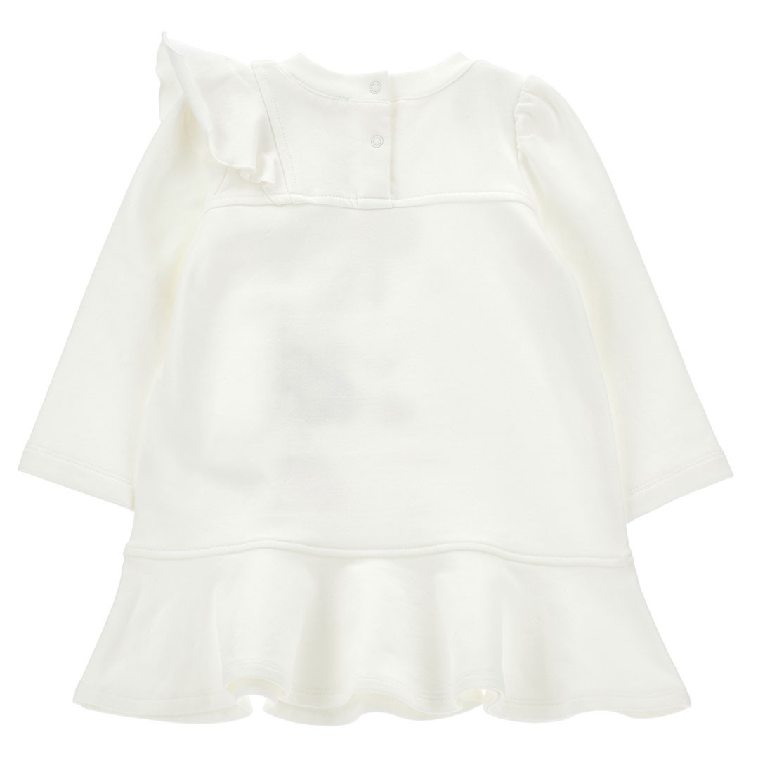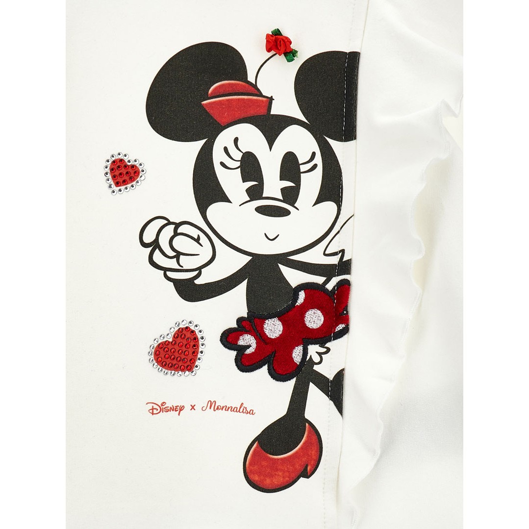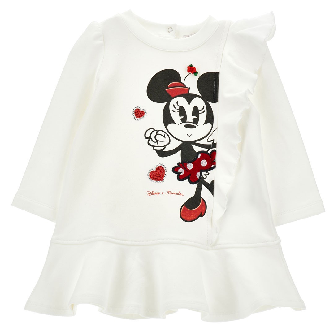 Bawełniana sukieneczka niemowlęca Monnalisa 39F903 6004 0001 przeznaczona dla dziewczynki do 3 lat, uszyta z miękkiej, śmietankowej dzianiny. Sukienka z długim rękawem jest wygodna i ciepła. Fason odcinany na biodrach z rozkloszowaną spódnicą i falbaną naszytą asymetrycznie w kierunku pionowym. Z tyłu przy szyi zapięcie ułatwiające zakładanie sukienki. Z przodu aplikacja przedstawiająca Myszkę Minnie.