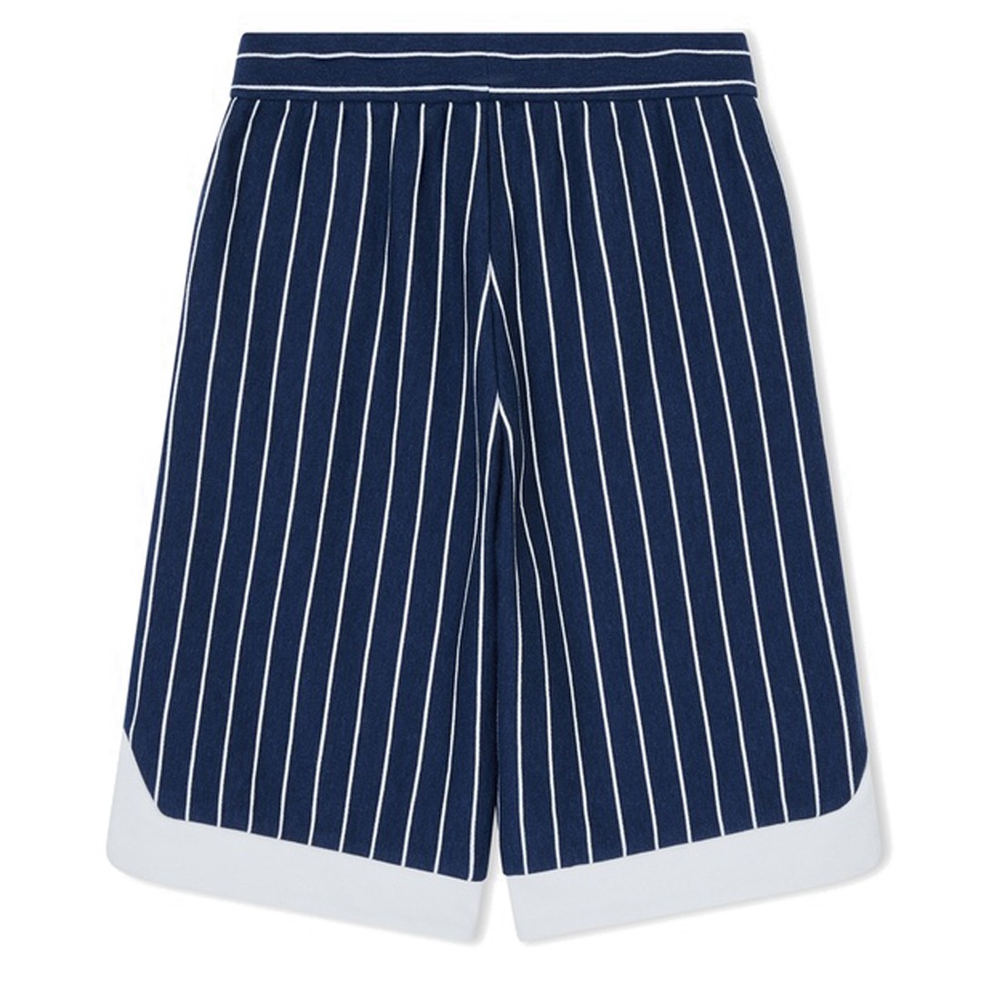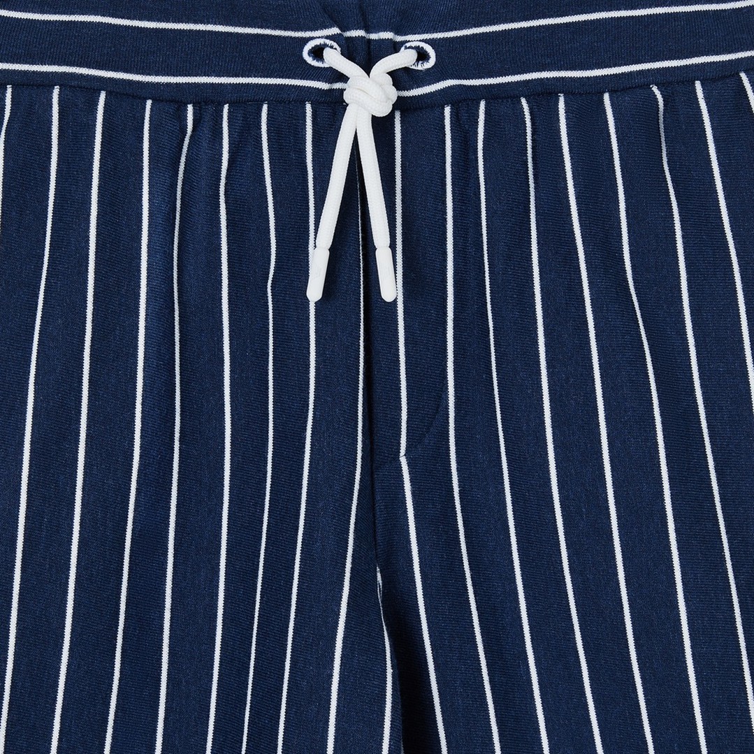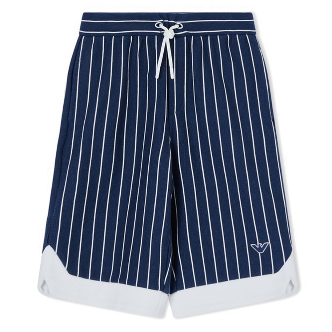 Bermudy dla chłopca Emporio Armani EB001057 AF21874 FB016. Spodenki uszyte z bawełnianej, ciemnoniebieskiej dzianiny w białe paski. Dół nogawek wykonczony białą listwą. Po bokach bermudów umieszczono wpuszczane kieszenie.