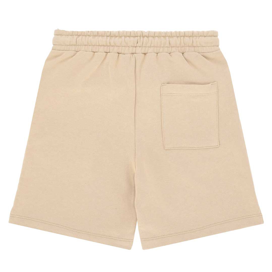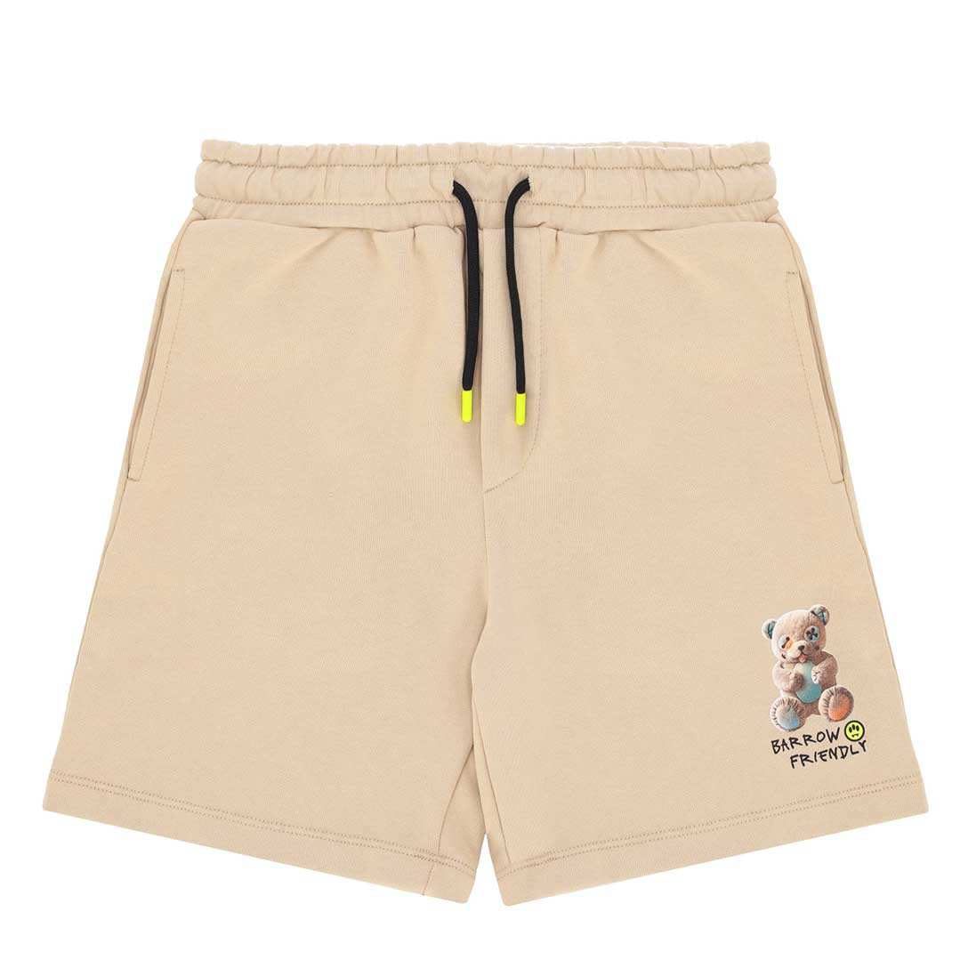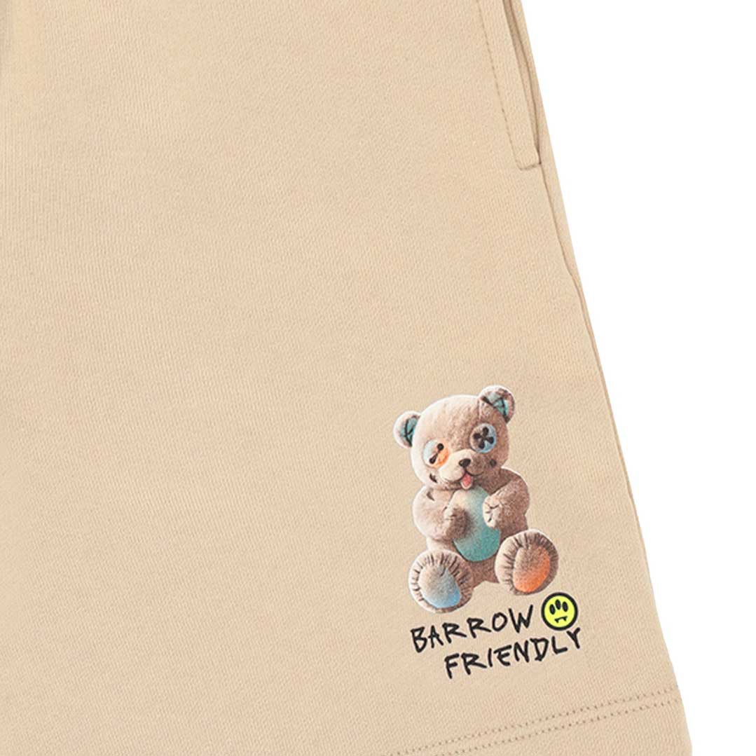 Beżowe, bawełniane szorty dla dziecka Barrow S6BKJUBE031 092. Z przodu na dole jednej nogawki nadruk przedstawiający misia. W pasie ptok. Model unisex.
