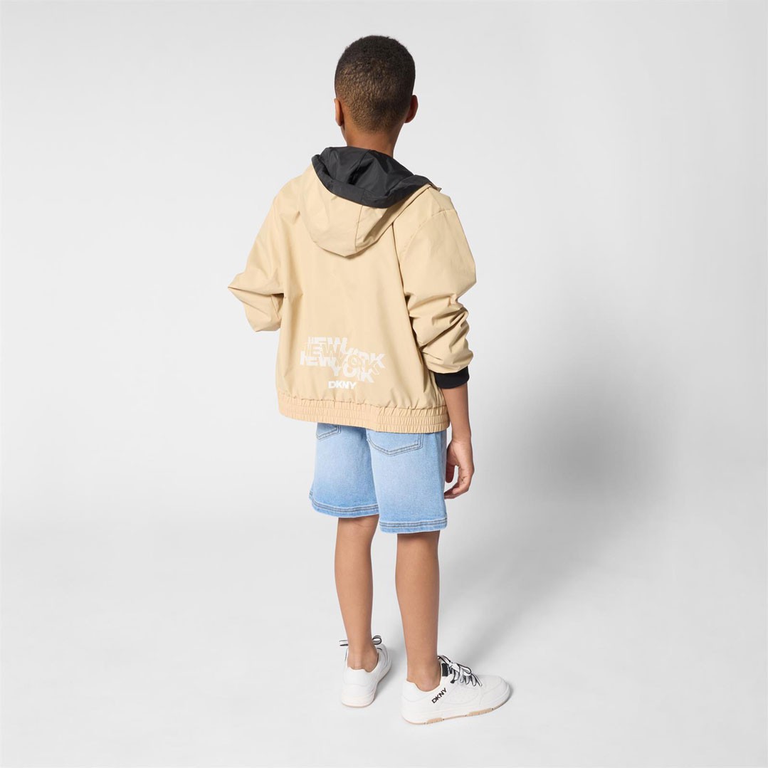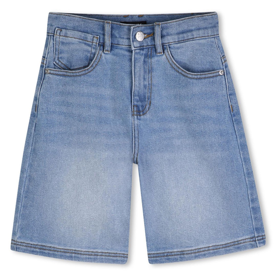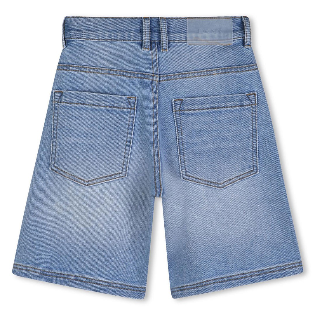 Jeansowe bermudy dla dziecka DKNY D62526 Z03. Model unisex dla chłopca i dziewczynki uszyty z denimu w niebieskim kolorze. Bermudy o swobodnym kroju. Do rozmiaru 10 lat w pasie regulacja obwodu.