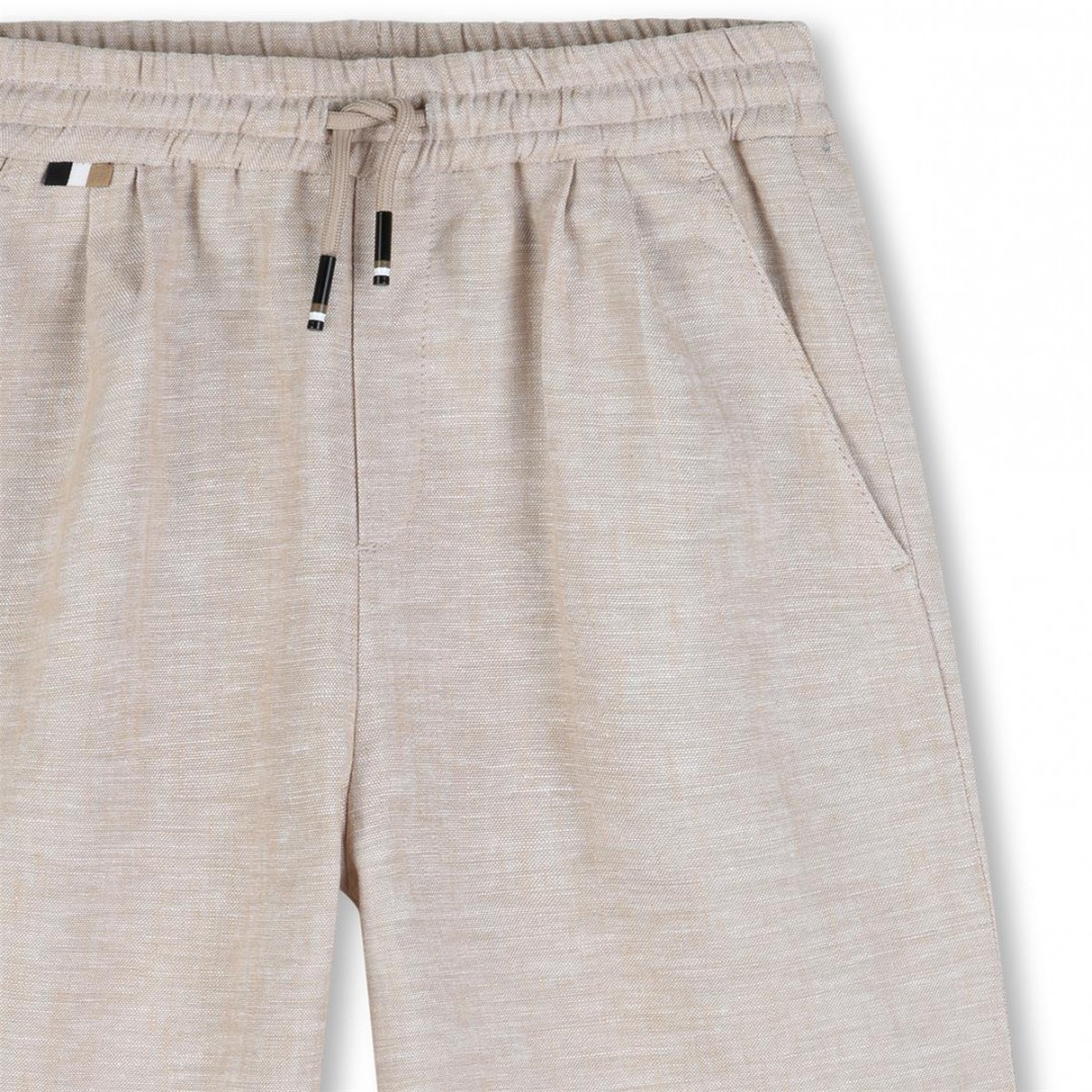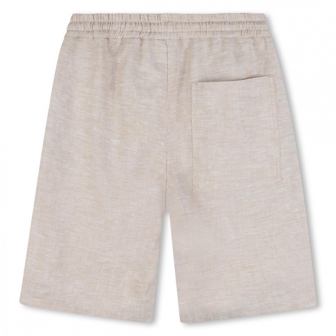 Jasne, przewiewne bermudy niemowlęce dla chłopca w wieku 3 - 36 miesięcy Hugo Boss J52875 130. Szorty w naturalnym kolorze uszyte z przyjaznej dla skóry dziecka mieszanki lnu i bawełny.