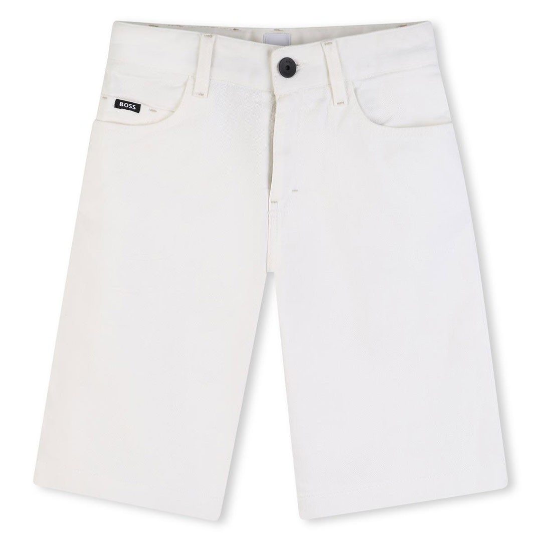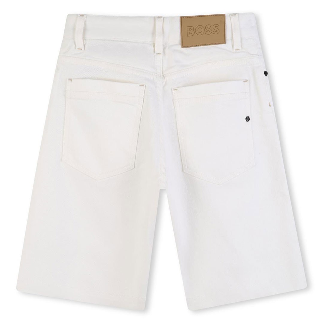 Białe bermudy chłopięce Hugo Boss J53244 10P. Klasyczny model z 5 kieszeniami. W pasie regulacja do rozmiaru 10 lat.