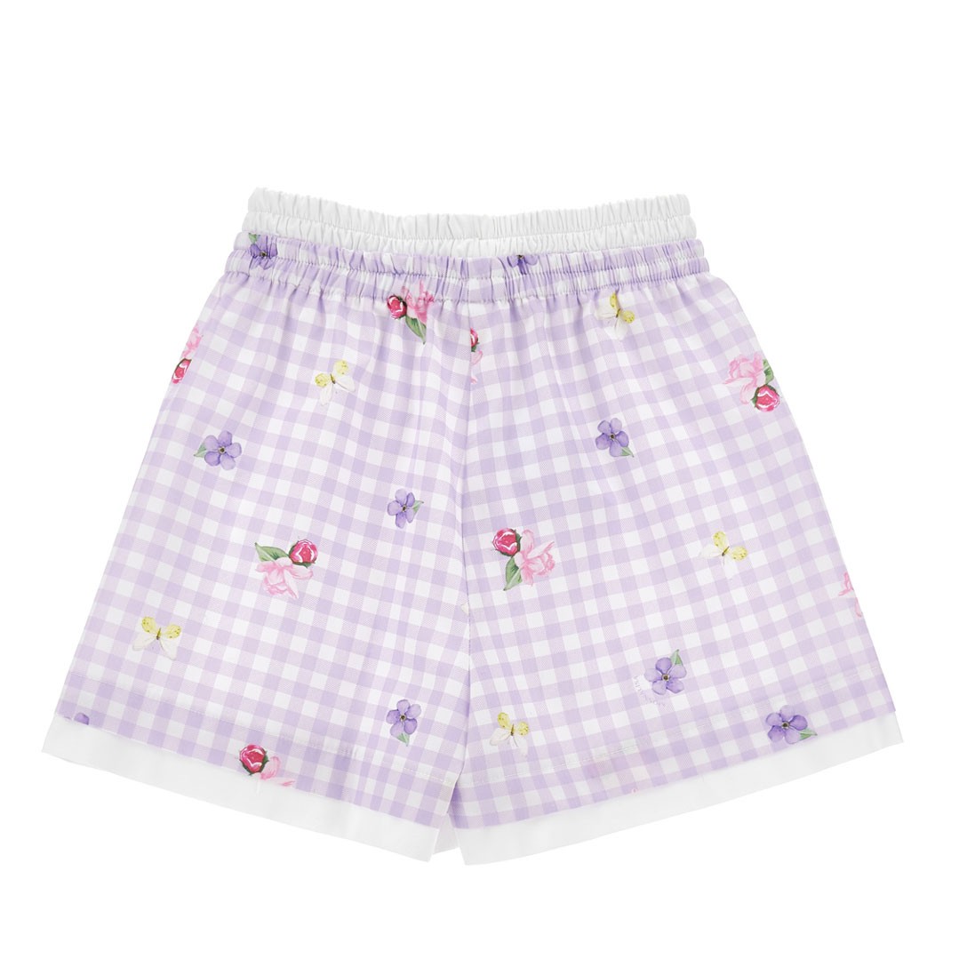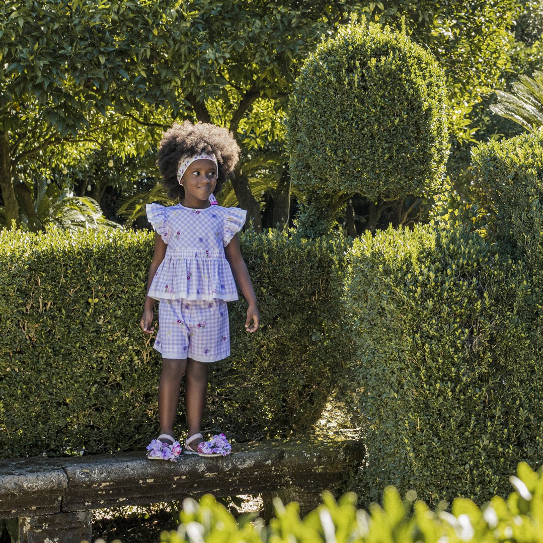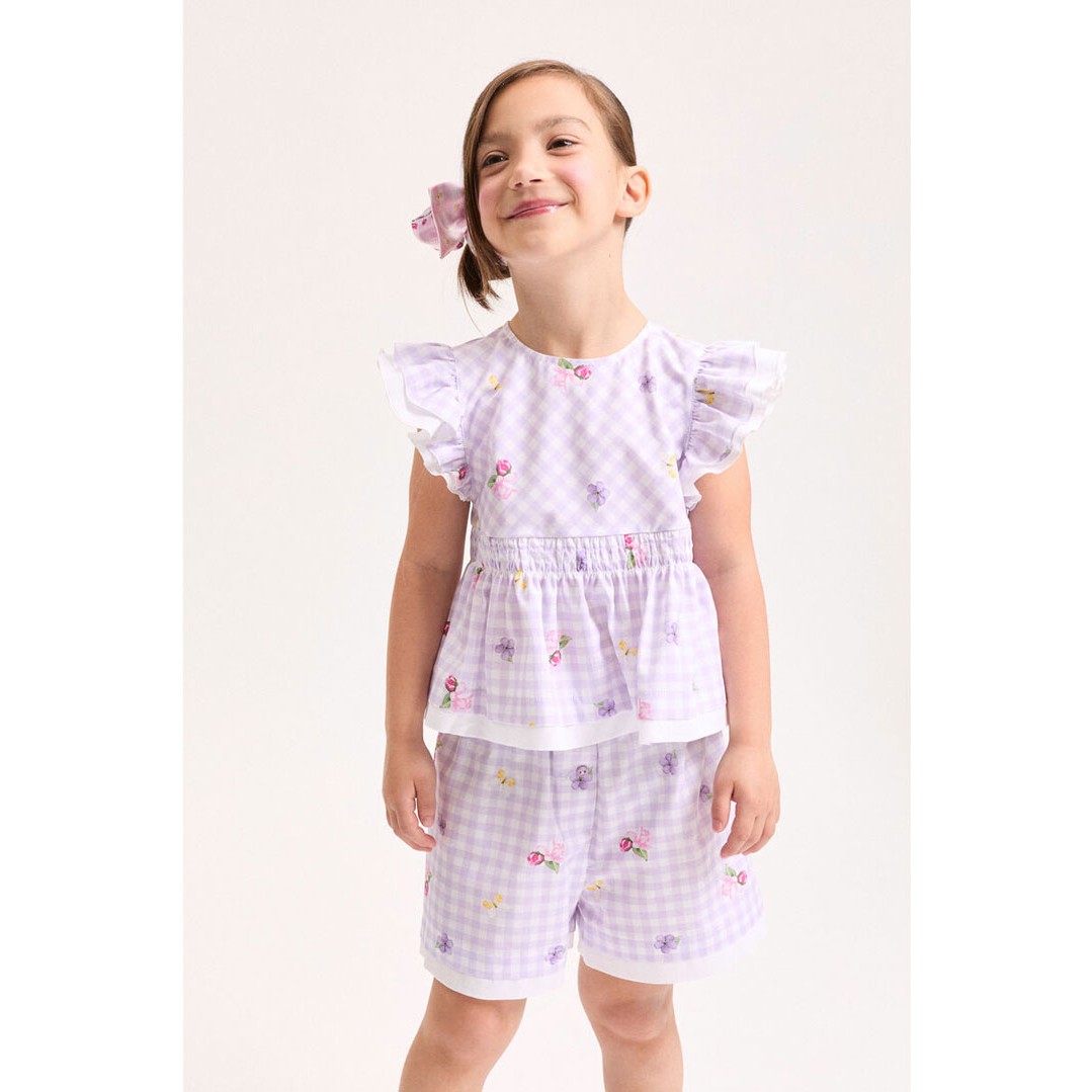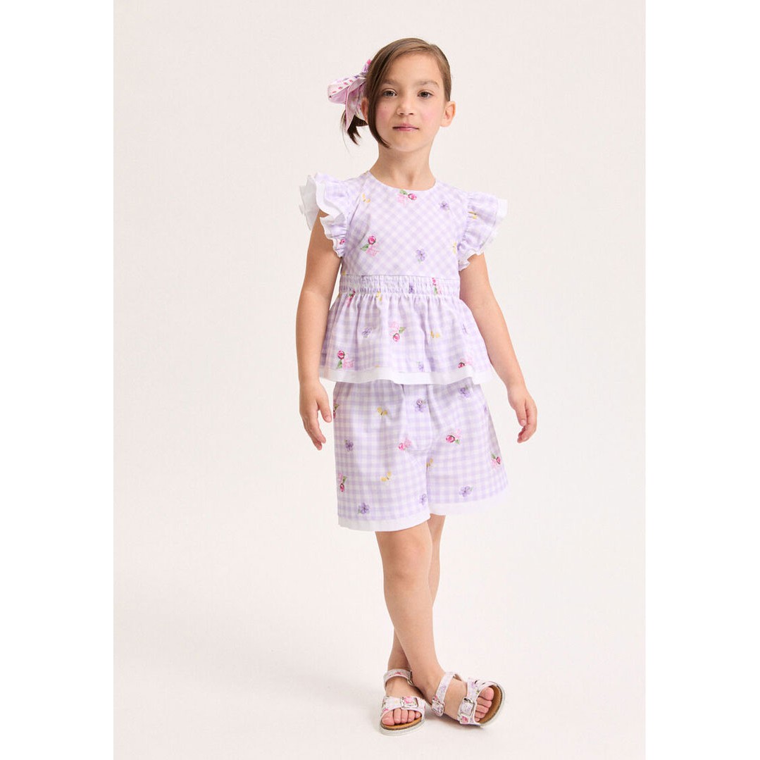 Letnie szorty dziewczęce Monnalisa 11G409 7620 0065. Swobodny krój szortów i delikatna, przewiewna popelina z przyjaznej dla skóry bawełny, gwarantują komfort i wygodę. Szorty wykonane są z romantycznej tkaniny drukowanej w pastelową, ukośną kratkę ozdobioną kwiatowym wzorem.