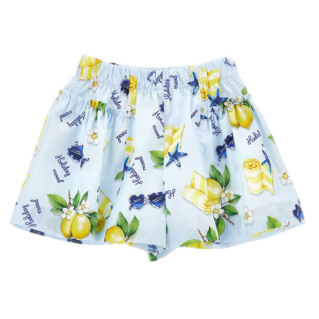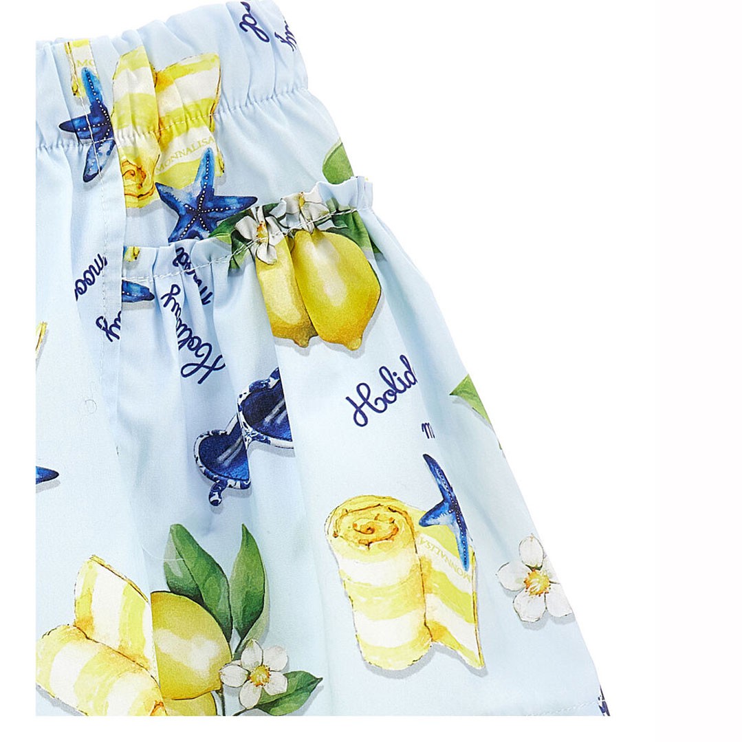 Szorty dla dziewczynki Monnalisa 11G417 7624 0052. Krótie spodenki o swobodnym kroju, gwarantujące dziecku wygodę, wciągane, bez zapięcia z szeroką gumą w pasie. Szorty 11G417 7624 0052 są uszyte z przewiewnego, bawełnianego płócienka w pastelowym błękicie, które drukowane jest w cytryny i elementy marynistyczne. Do szortów pasują zwłaszcza inne ubrania dziewczęce Monnalisa Bimba Main Trilli.