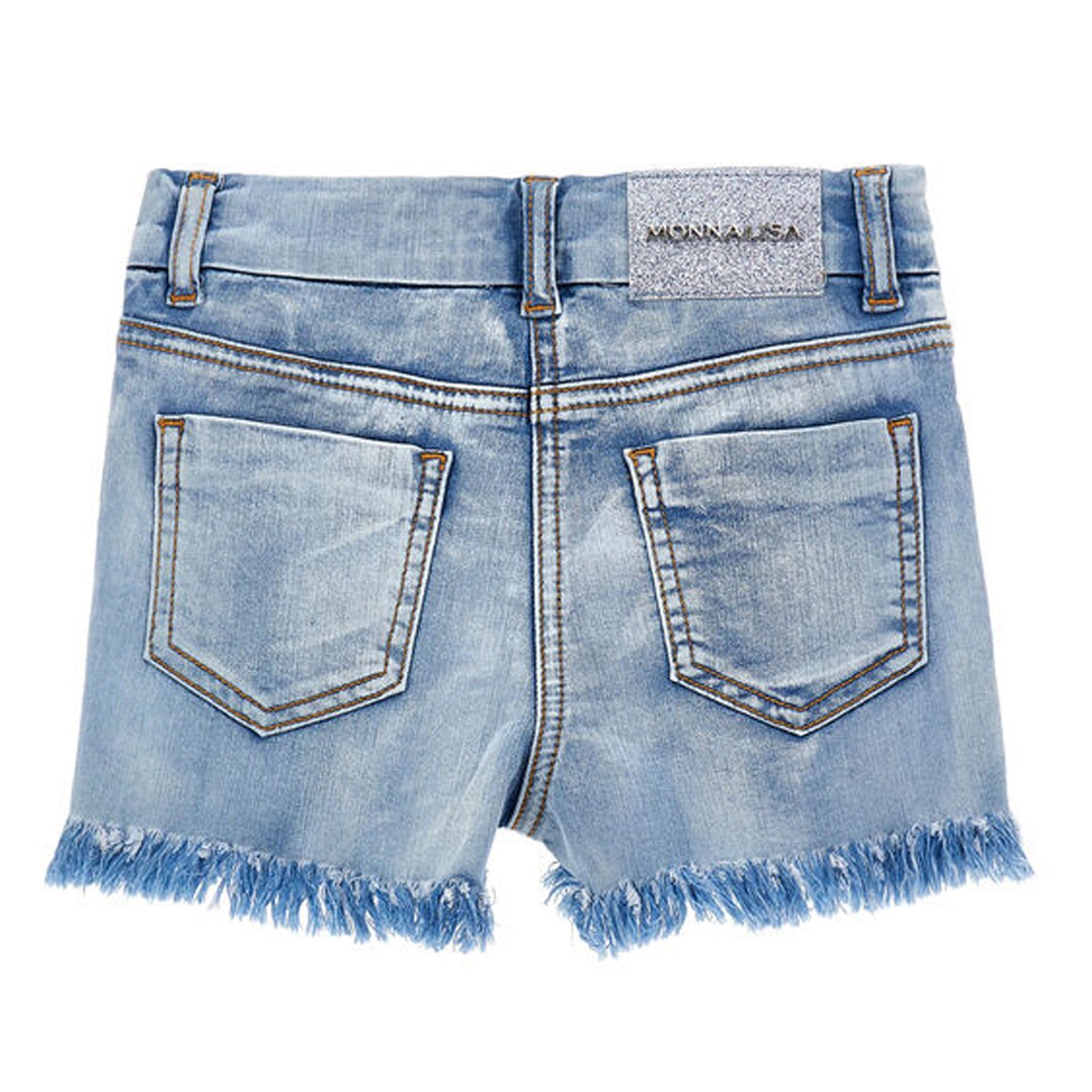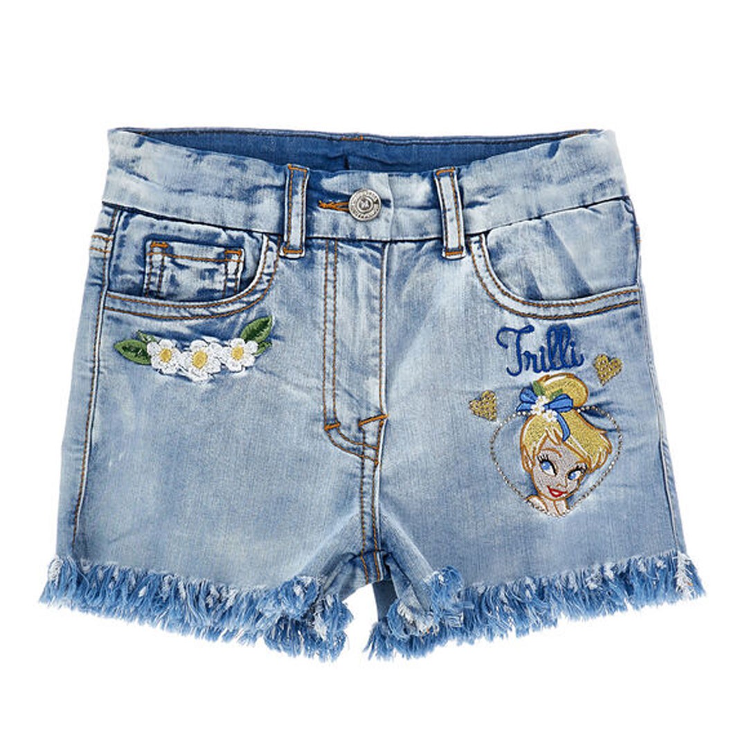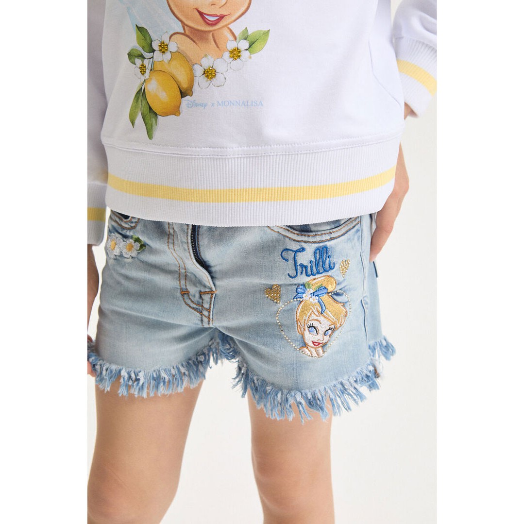 Jeansowe szorty dla dziewczynki Monnalisa 19G416 7013 0062 Bimba Main Trilli. Spodenki uszyte z cienkiej tkaniny wygladem przypominającej jeans. Model klasyczny z 5 kieszeniami i postrzępionymi nogawkami. Z przodu piękne hafty.