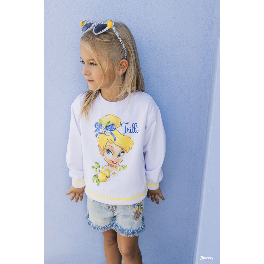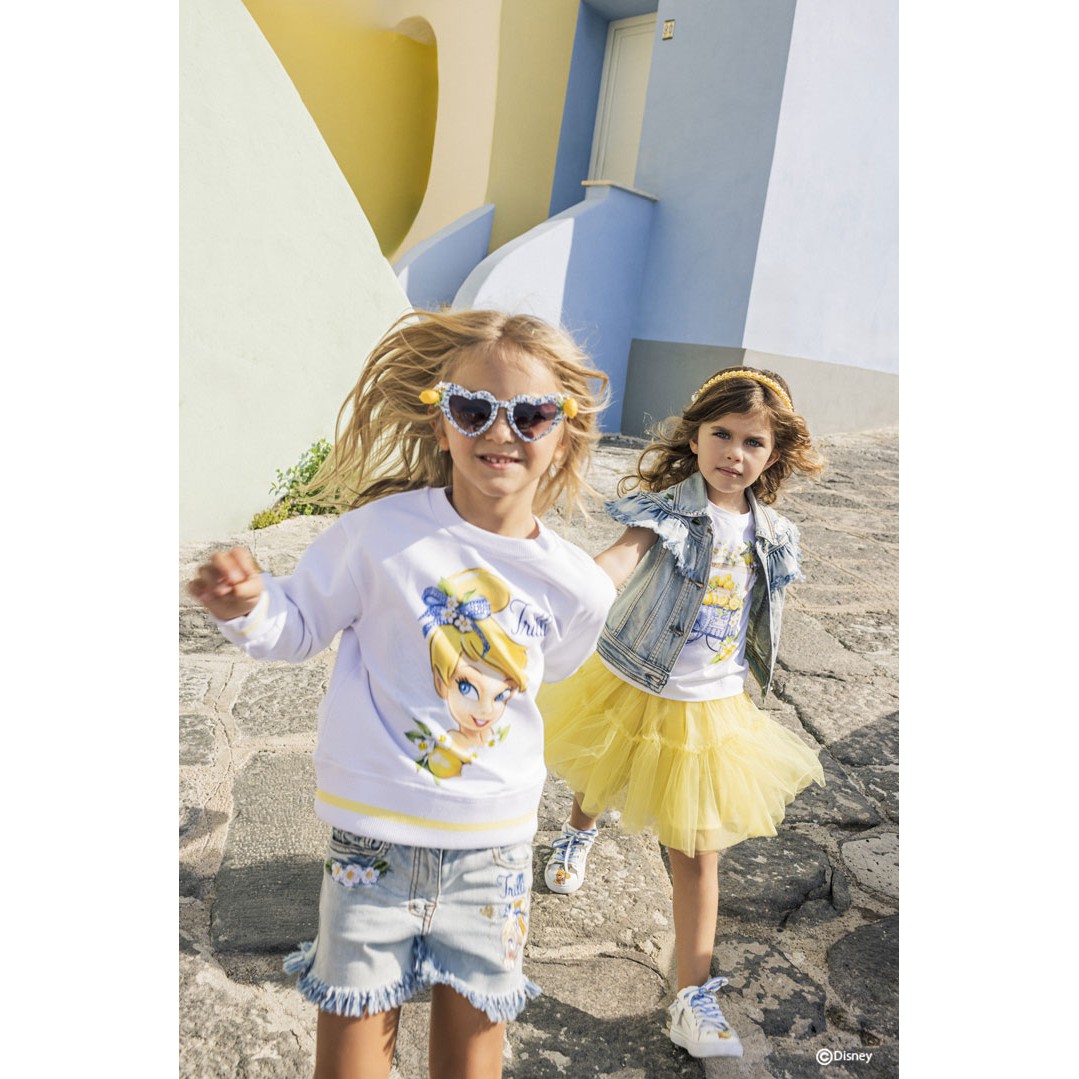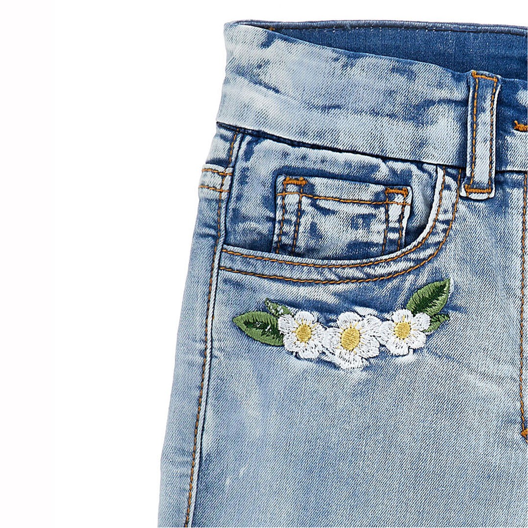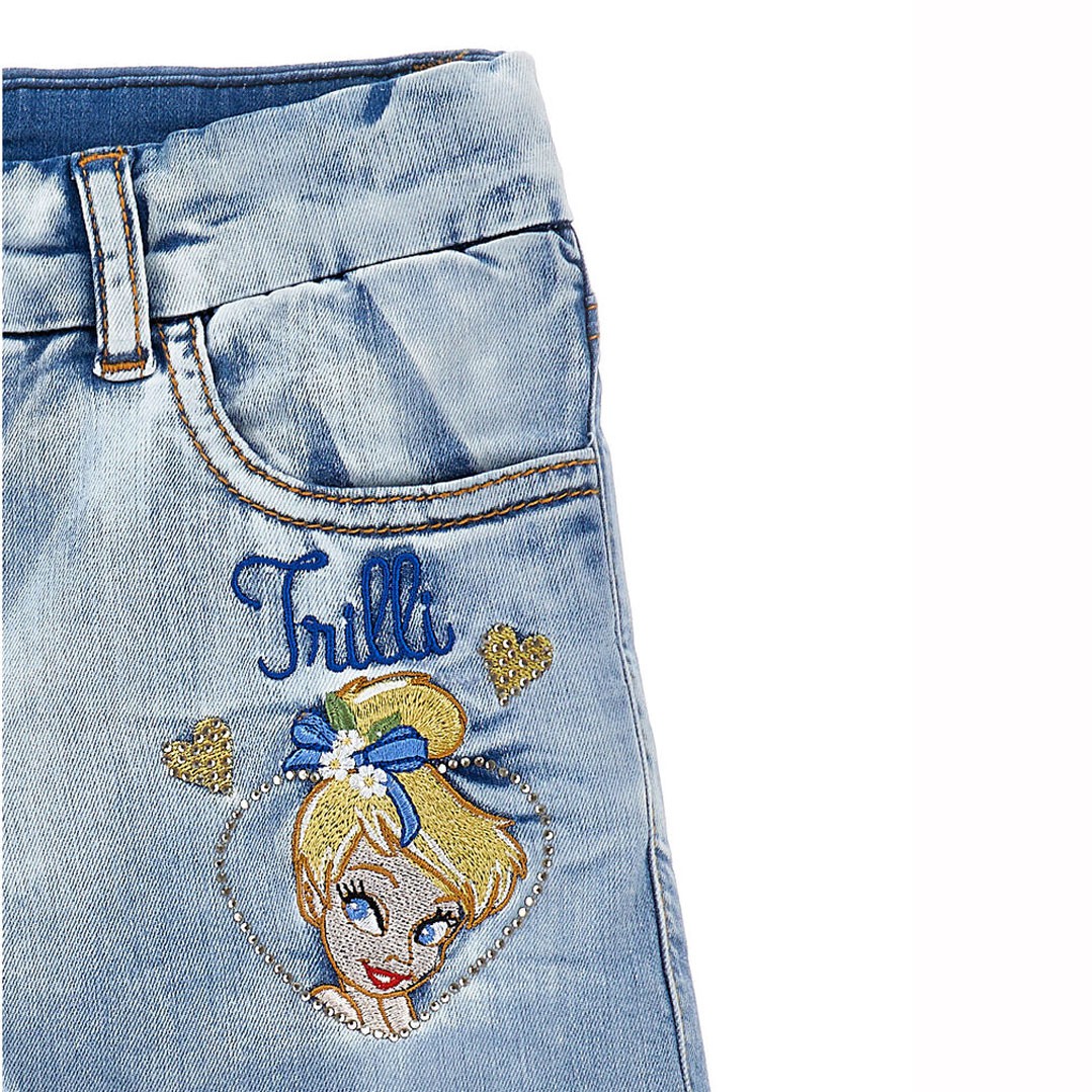 Jeansowe szorty dla dziewczynki Monnalisa 19G416 7013 0062 Bimba Main Trilli. Spodenki uszyte z cienkiej tkaniny wygladem przypominającej jeans. Model klasyczny z 5 kieszeniami i postrzępionymi nogawkami. Z przodu piękne hafty.
