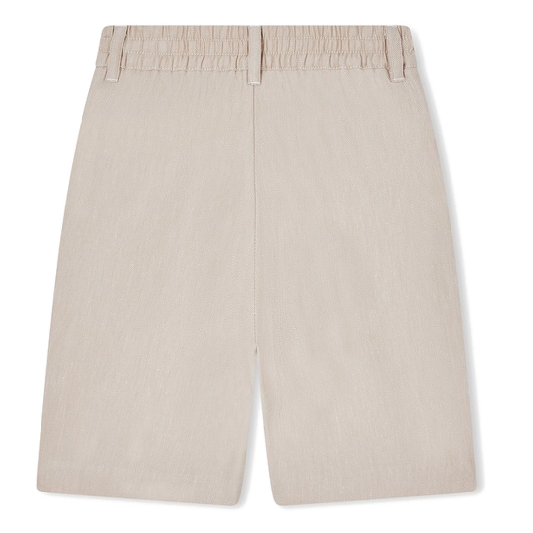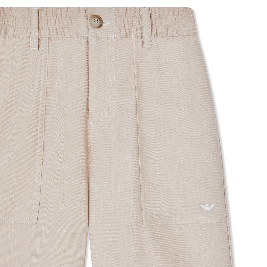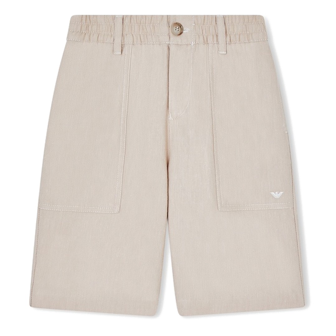 Beżowe bermudy chłopięce Emporio Armani EB001063 A20957 U6151. Krótkie spodenki idealne na lato uszyte z przewiewnej mieszanki lnu i bawełny.